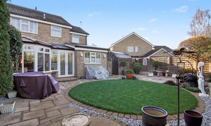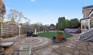 Rear garden - Patio the full width of the rear of the property. The garden has a circular laid lawn with enclosed fencing. Further raised decking area with an arbour seat. Outside light, tap, and electric point.