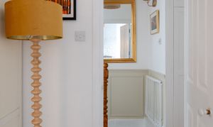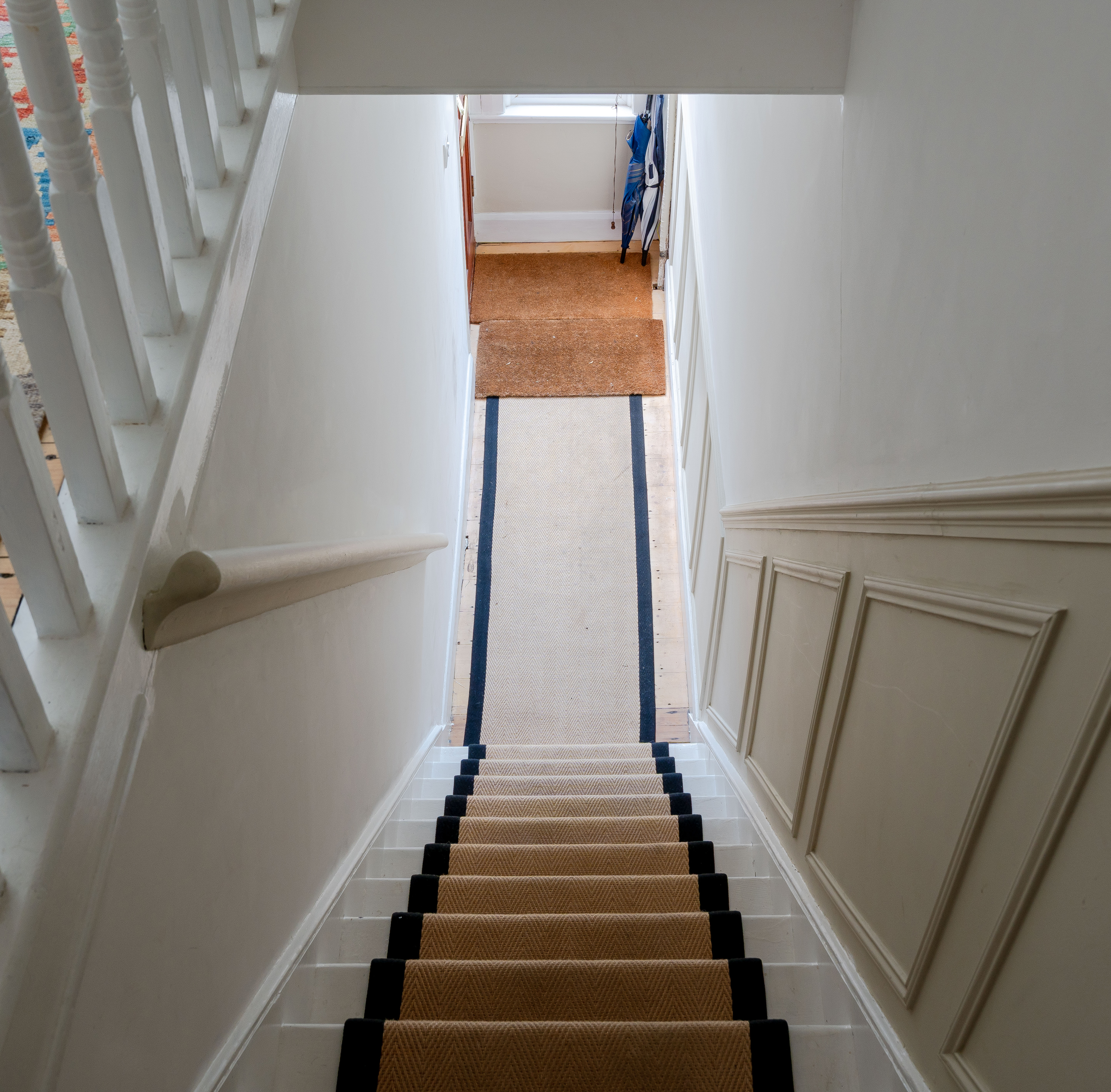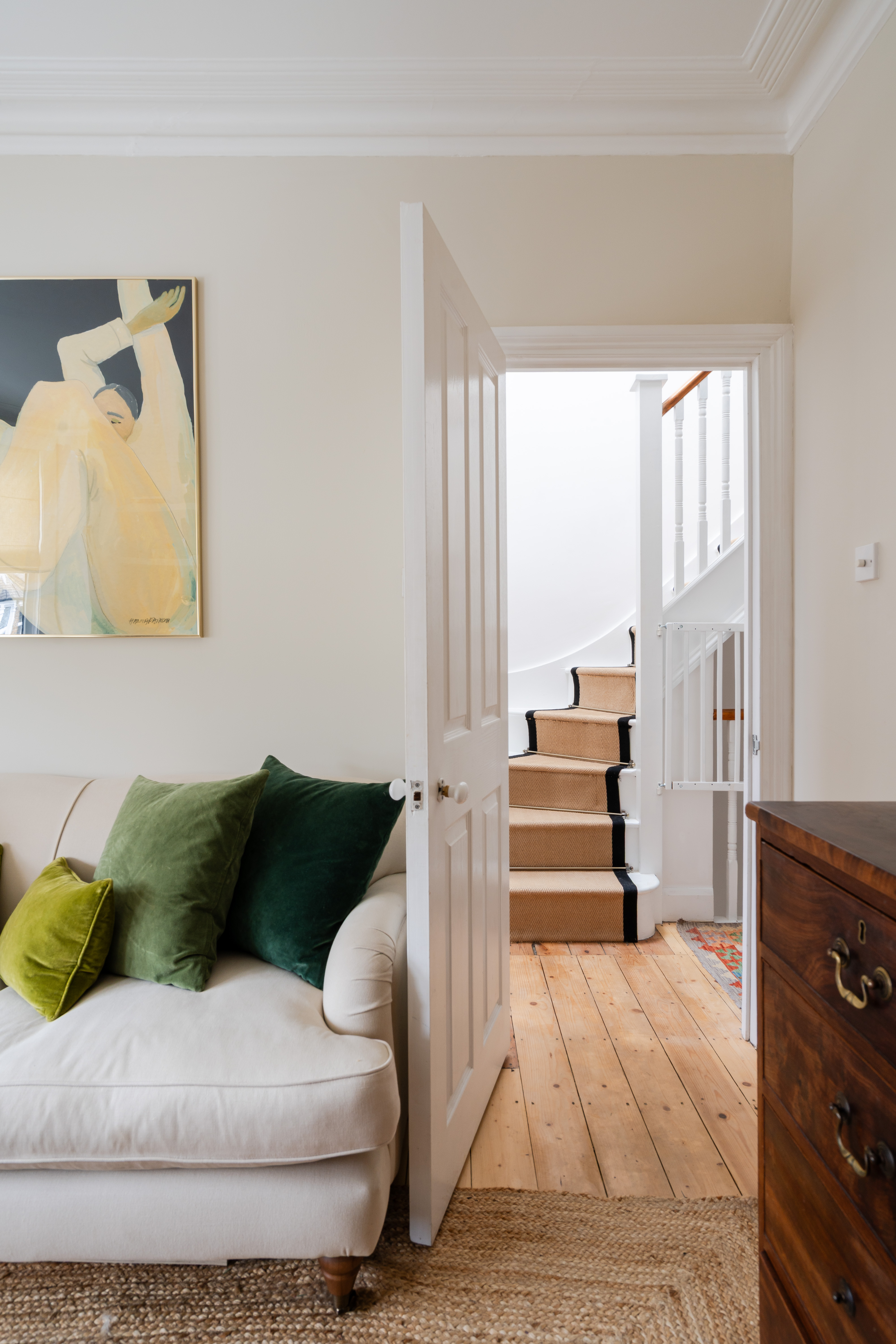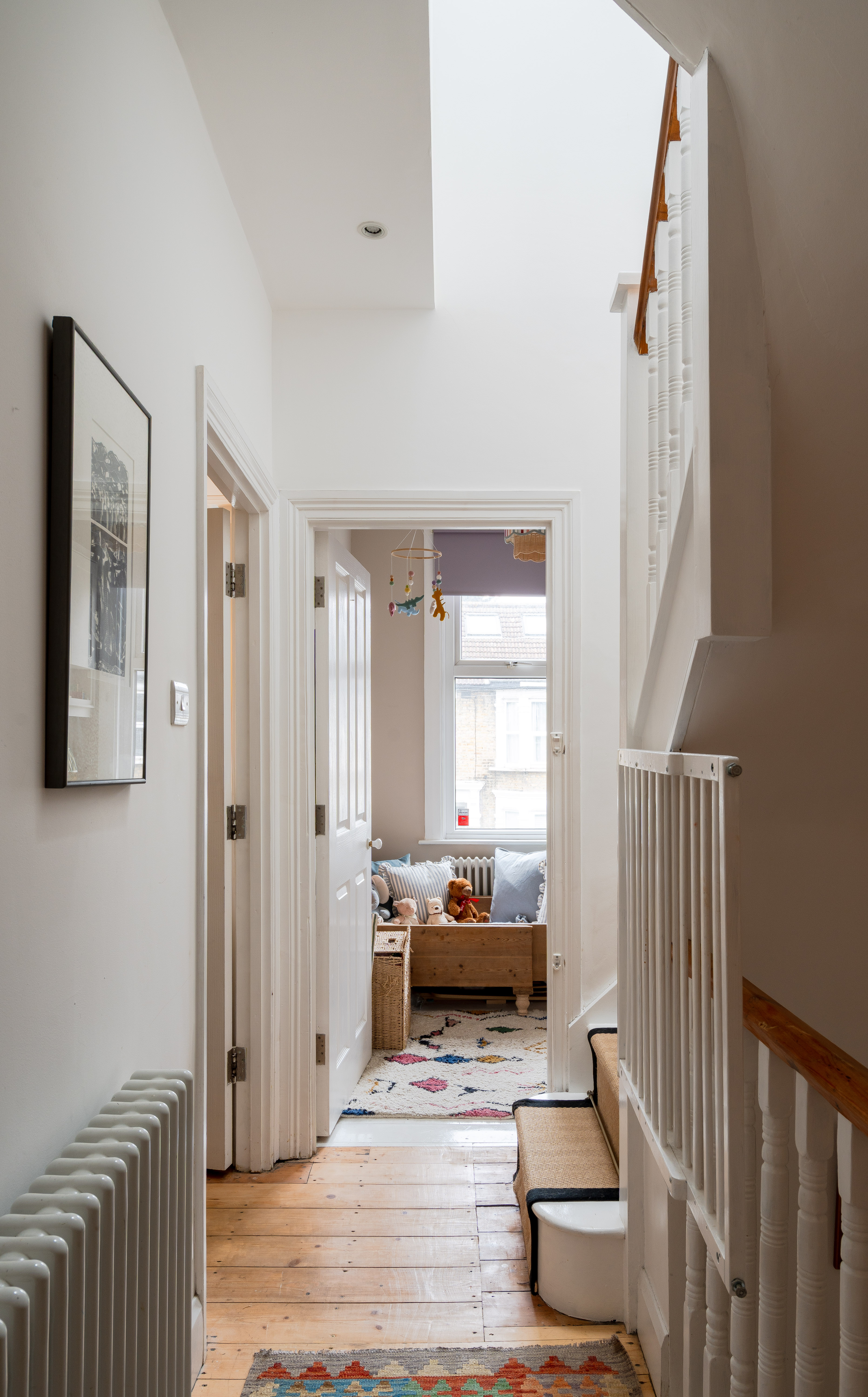 An attractive herringbone jute runner, trimmed in black, leads up a white-painted staircase to arrive at the first floor. The first thing you’ll notice is the light that floods in from a skylight in the converted loft, giving the whole property a bright, airy feel. White walls and characterful sanded floorboards add to the calm vibe, while the column-style radiator – a feature seen in every room – illustrates the quiet attention to detail shown throughout.