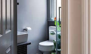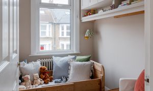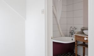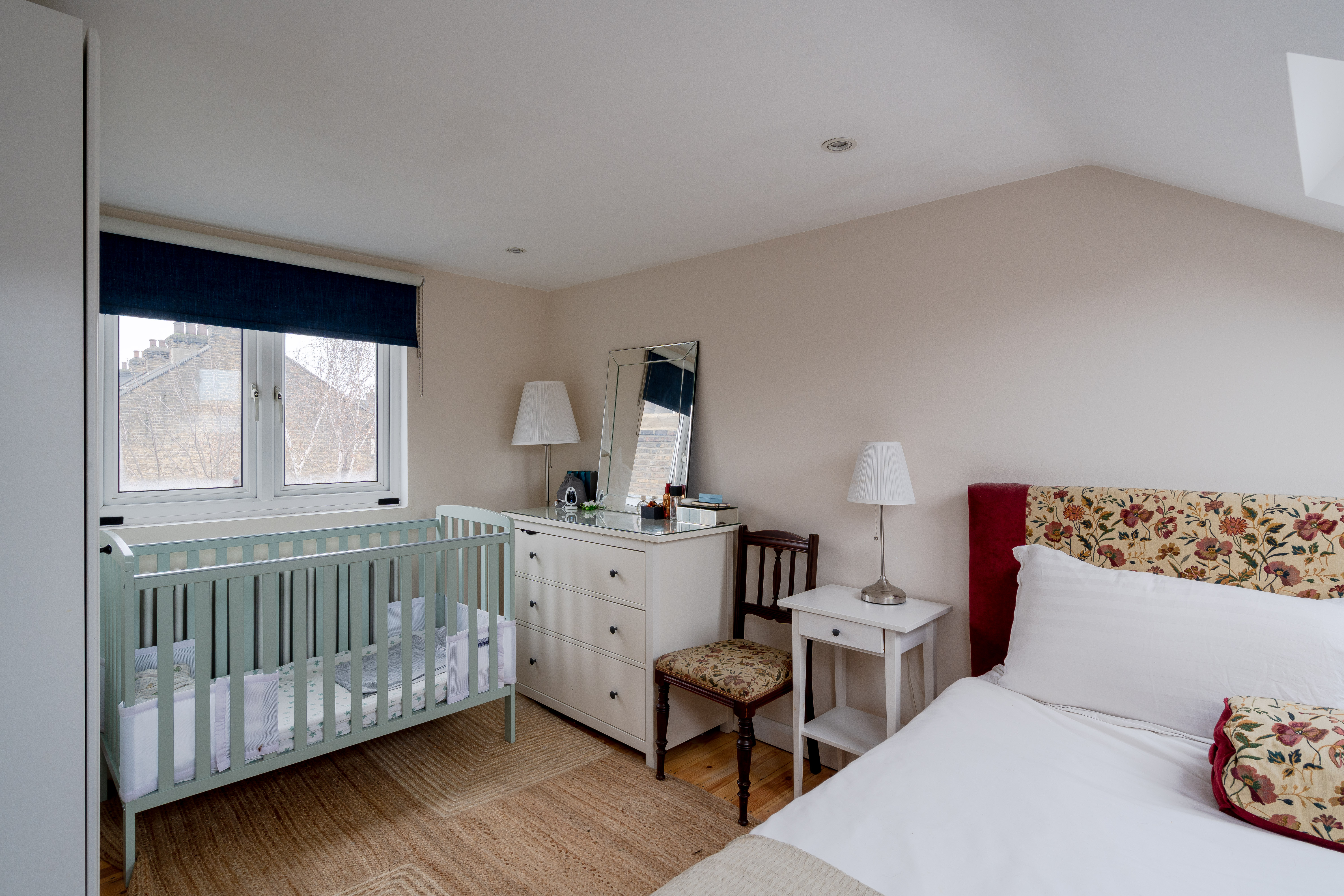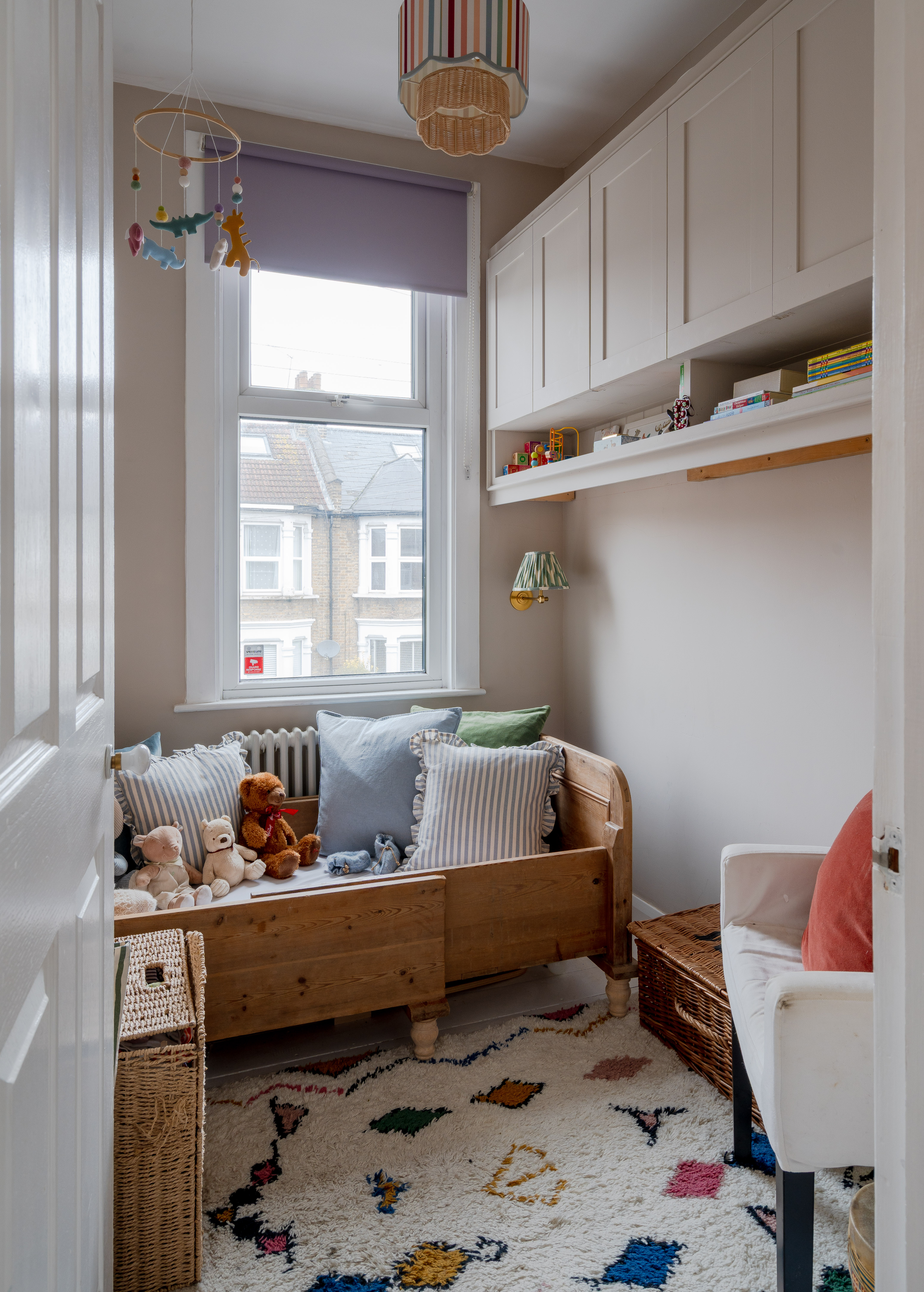 You’ll find a single bedroom, adjacent. Decorated in similar tones, the floorboards here are painted white, while the tall front-facing window features a dusky blue roller blind. There’s also a column-style radiator and bespoke wall-mounted cabinetry and shelving. Currently used as a nursery, it would make an ideal home office.
