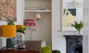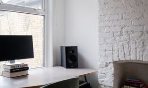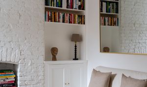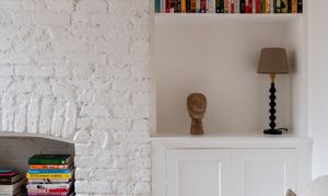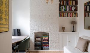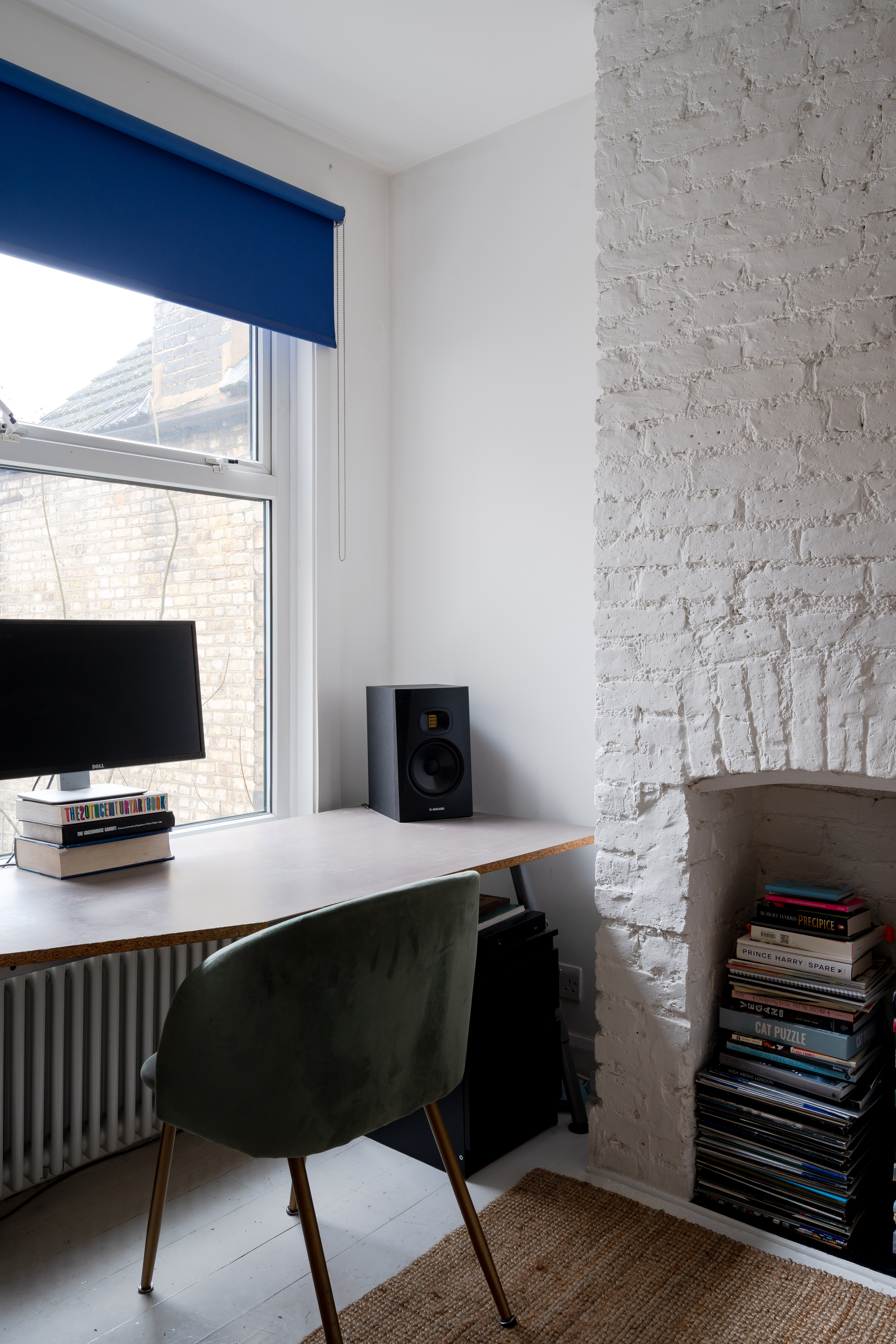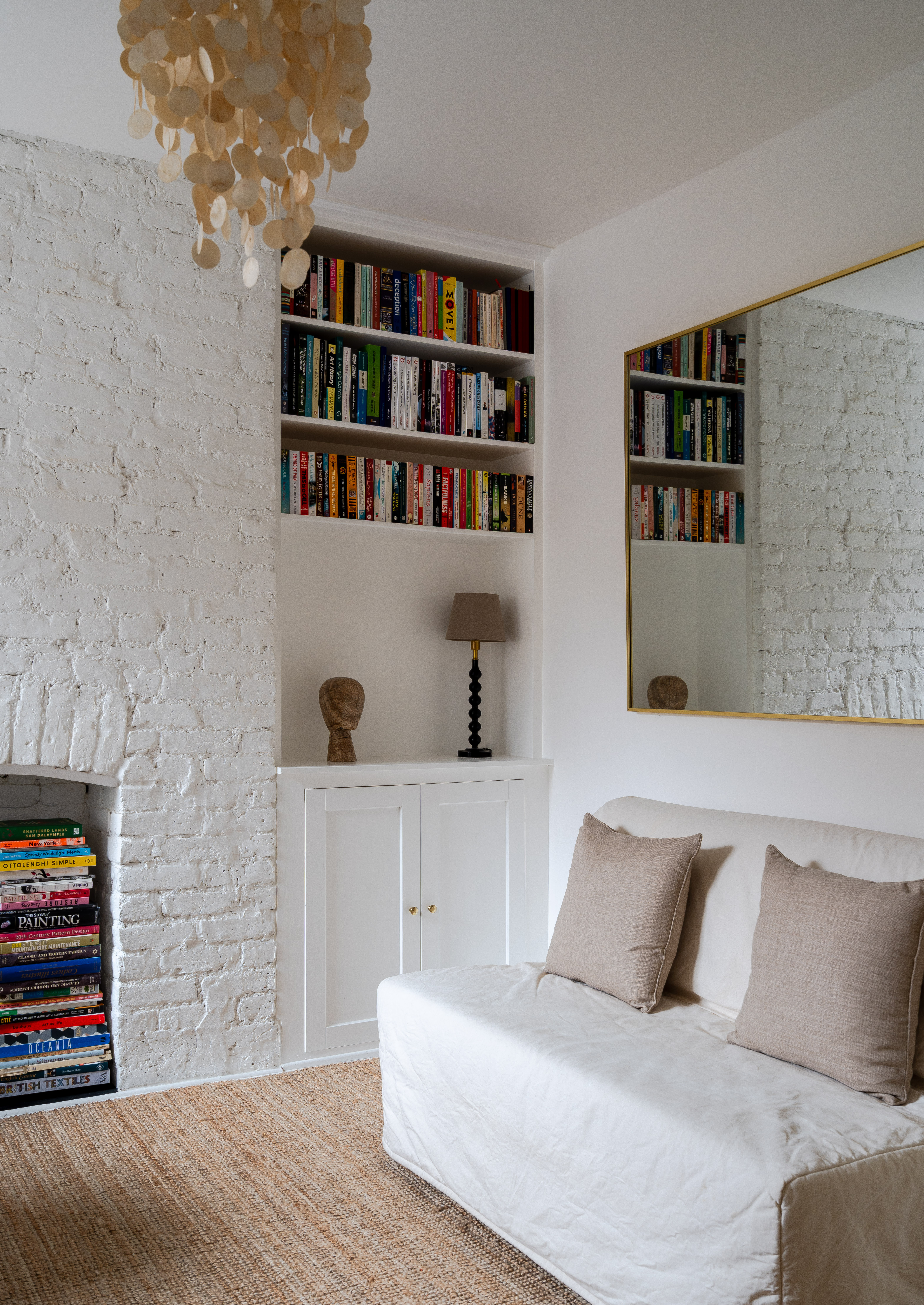 Beyond is the second bedroom, a good-sized double with a large rear casement (with a blue roller blind and a column-style radiator beneath) looking out to the garden. Every room in this property has something to delight, and here it’s a pretty, whitewashed exposed brick fireplace, complemented by white painted walls and floorboards. Nestled in the right-hand alcove, bespoke shelves and a cabinet match those in the living room.
