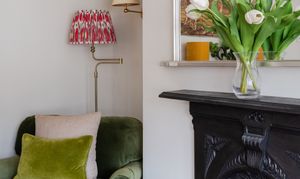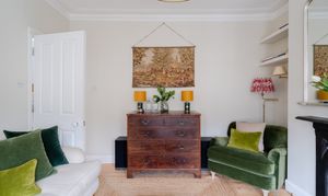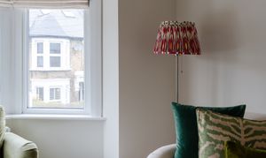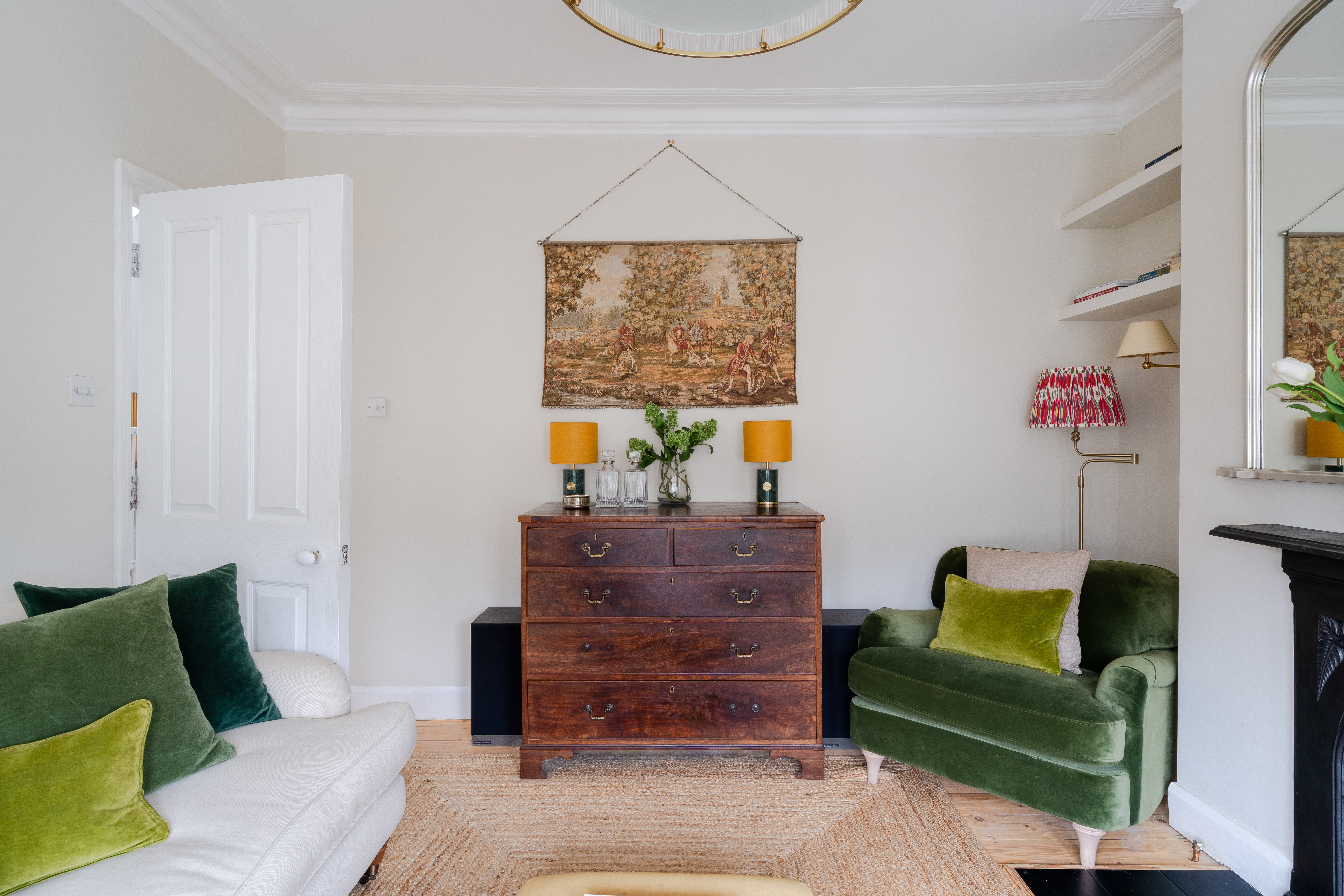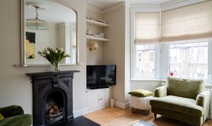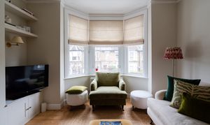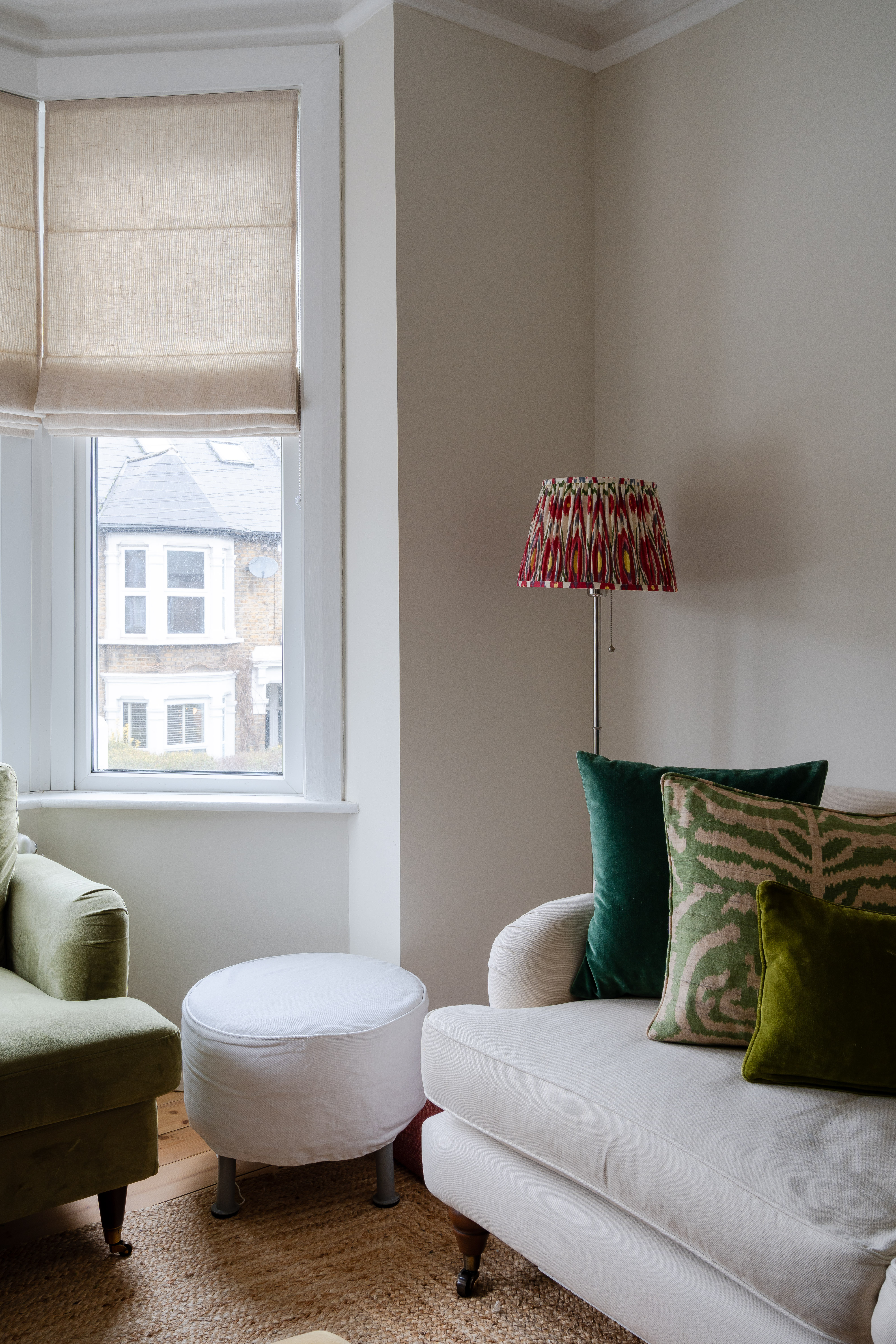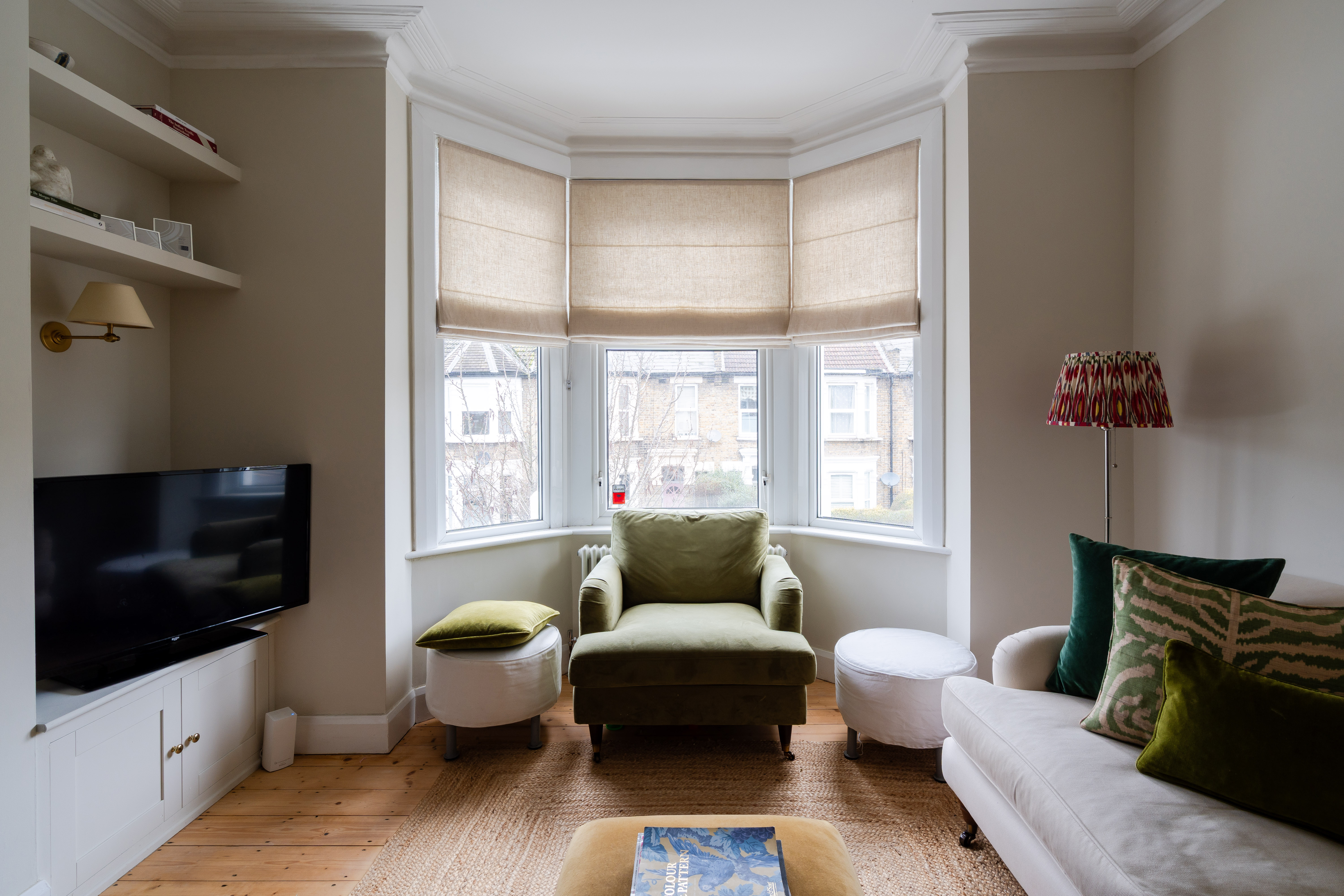 The sanded floorboards flow into the living room at the front. This elegant space is filled with light from a wide bay fitted with bespoke linen Roman blinds, with a column-style radiator beneath.