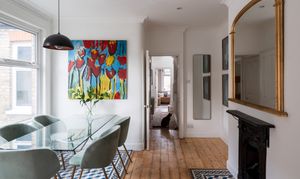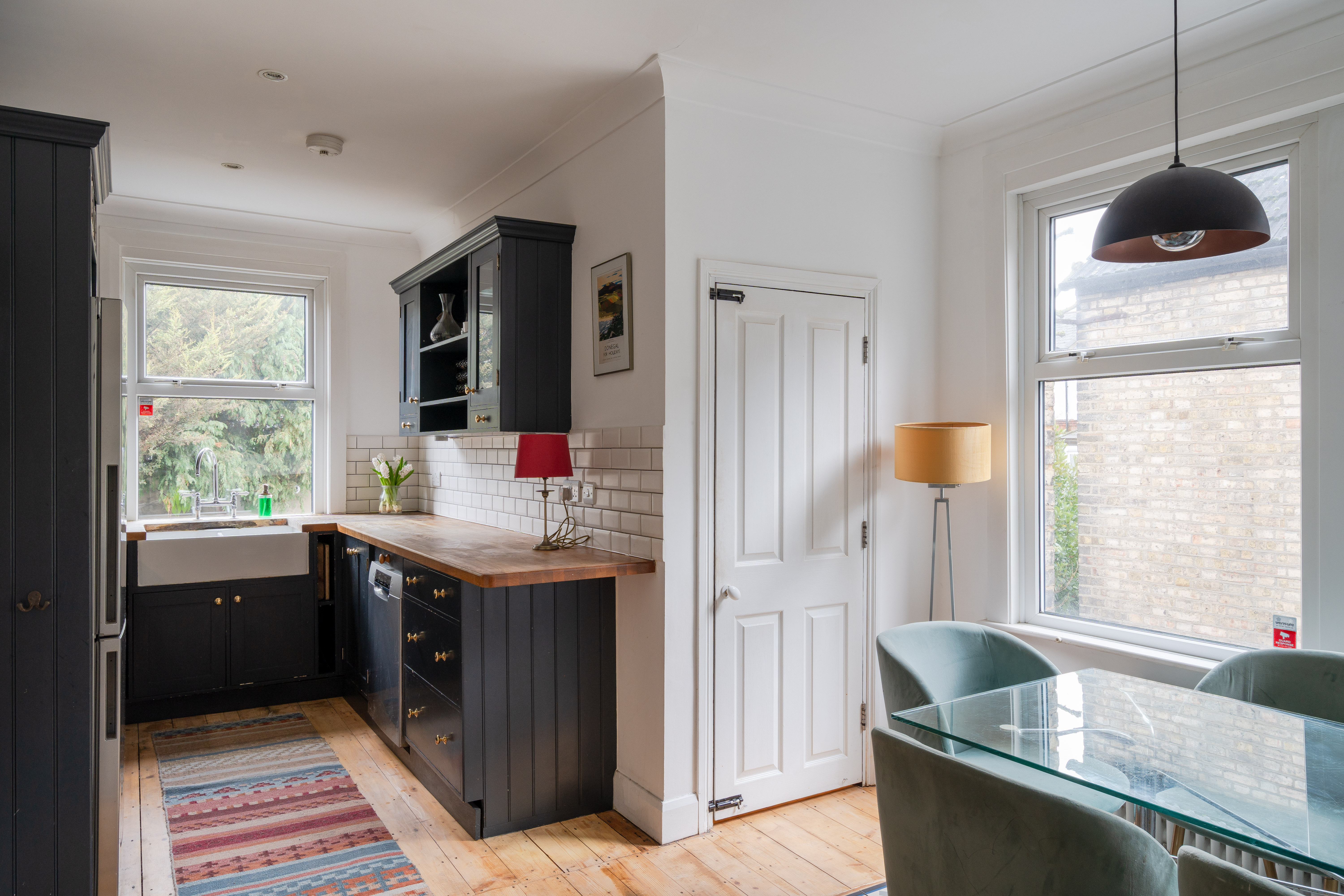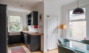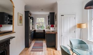 The spacious and sociable dining kitchen sits to the rear. Flooded with light from both a garden-facing window and a double window with a column radiator beneath, the walls are white, contrasting with the warm tones of the sanded floorboards underfoot. In the dining area, stylish geometric white, navy and grey floor tiles with a decorative border create a rug-like effect, a domed pendant further zones the space, and a cast-iron fireplace has a hearth tiled to match.