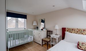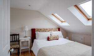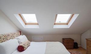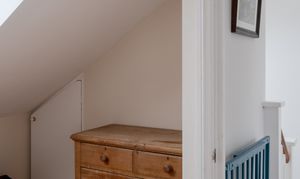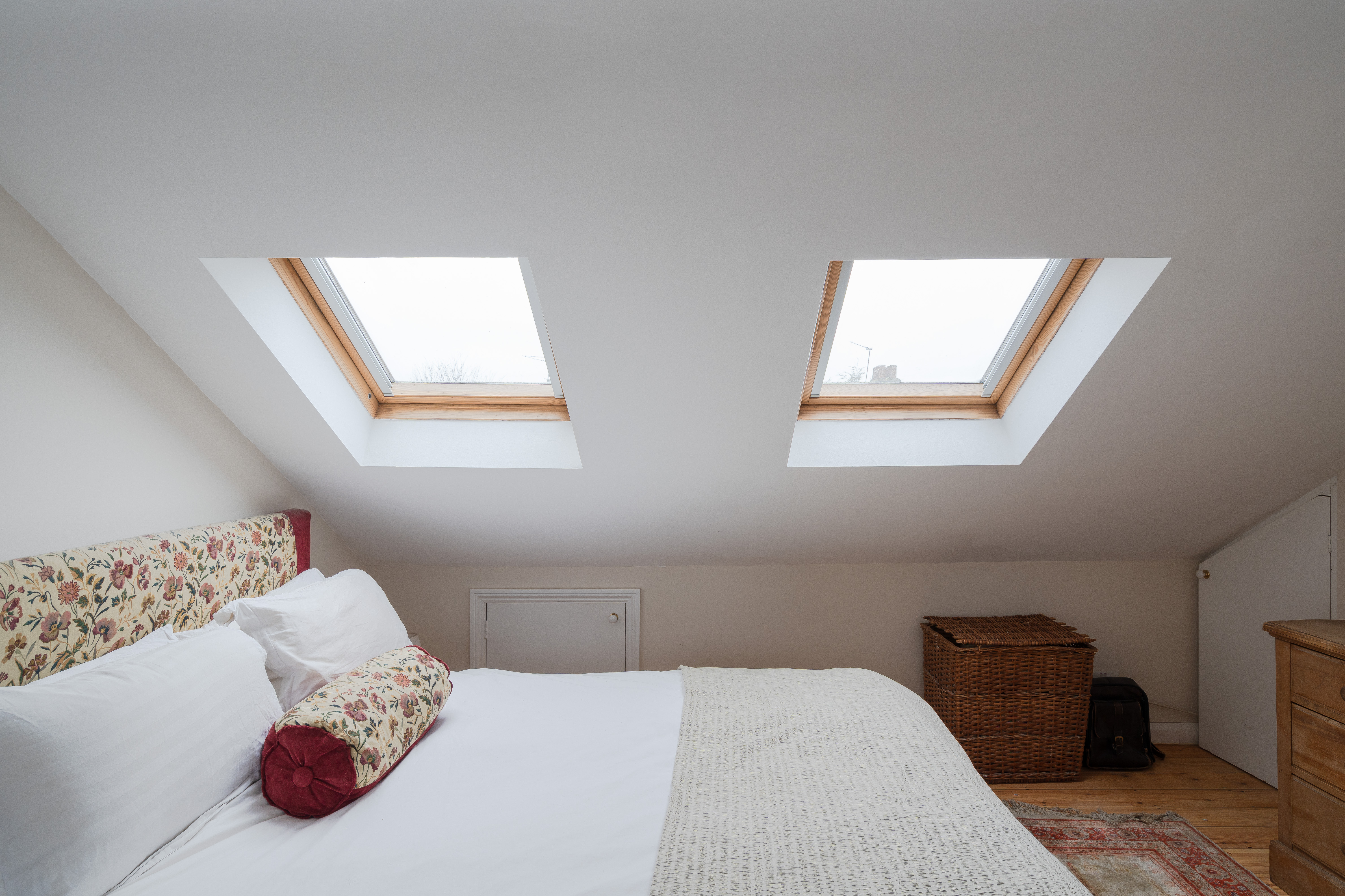 Returning to the landing, follow a second staircase with a jute runner to the loft floor and the primary bedroom. This peaceful dual-aspect space features a pair of front-facing timber-framed Velux windows and a rear double casement with a black roller blind. Sanded floorboards have been chosen to echo the ones downstairs, while the walls are a classic neutral shade. You’ll also find a column-style wardrobe, bespoke cupboards in the eaves, and space for an inbuilt wardrobe should you require even more storage in the future.