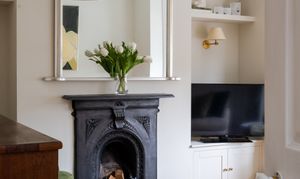 Walls in a pale stone shade rise to a coved ceiling with a rose ready for a pendant. A cast-iron period fireplace with a black tiled hearth creates a focal point flanked by bespoke shelving and a television cabinet with shaker-style doors and brass knobs.