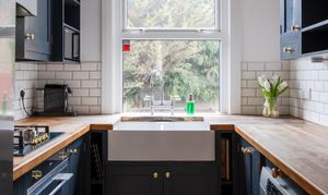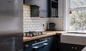 In the kitchen, smart inky-blue in-frame cabinetry pairs with solid oak worktops and a white metro-tiled splashback. There’s a fabulous double butler sink with a chrome tap, while appliances include a Smeg oven and four-ring gas hob with overhead extractor. There’s also space for a freestanding dishwasher, microwave and fridge-freezer.