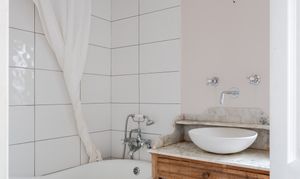 The second bathroom, adjacent, is a real treat. Pale blush walls, white wall tiles and the same geometric floor tiles seen elsewhere form the backdrop to a luxurious freestanding slipper bath with a plum exterior and clawed feet, featuring a traditional-style shower handset. A countertop basin sits atop an antique wood and marble vanity unit, and there’s also a close-coupled loo.