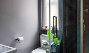 Returning to the hallway, continue along past a useful full-height storage cupboard to the family bathroom, where dove-grey walls pair with striking charcoal and teal mosaic wall and floor tiles. Lit by a tall frosted glazed window, there’s a shower with a glass screen, a close-coupled loo, and a vanity tiled to match the walls, with a countertop basin and mixer tap.