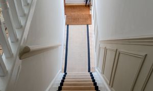 To your left, the private front door leads to a ground-floor hall with sanded floorboards and taupe-painted panelling, illuminated by a tall front-facing window.