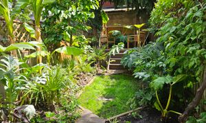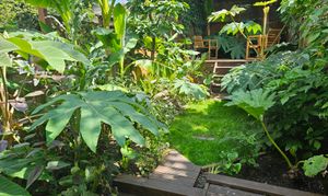The private, southeast-facing 30-foot garden enjoys sunshine throughout the day. Enclosed by grey-green painted timber fencing on both sides, there’s an upper decked seating area to the rear. At the same time, a lower lawn is bordered by beds filled with mature evergreen plants, such as Chusan palms and Fatsia japonica, for a leafy, tropical feel year-round.