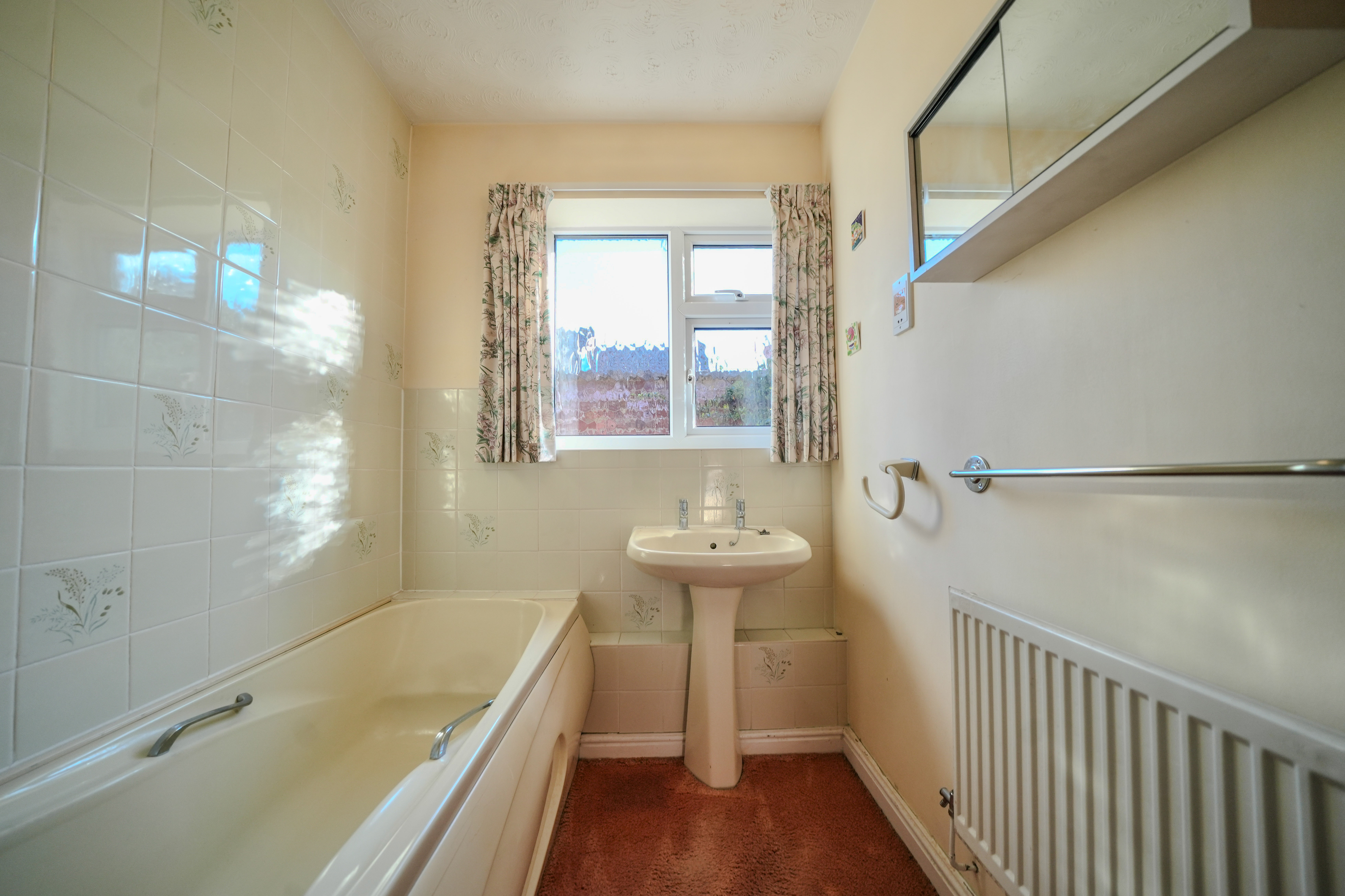 uPVC double glazed window to the side aspect, panel sided bath with mixer tap over and shower attachment, pedestal wash hand basin, wall mounted radiator, shaver point, part tiled walls and carpeted flooring.