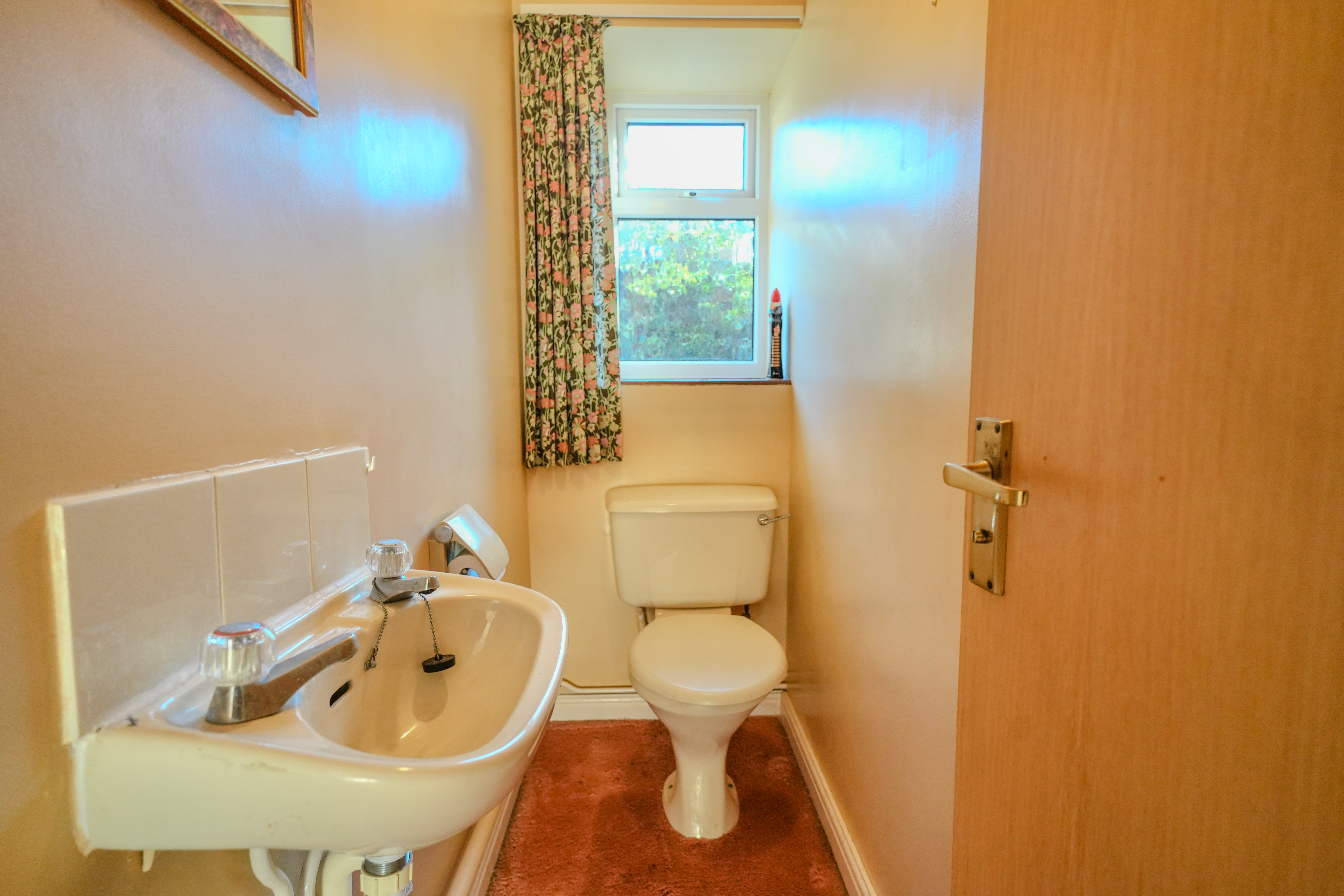 uPVC double glazed window to the side aspect, carpeted flooring, extractor fan, wall mounted wash hand basin and low level WC.