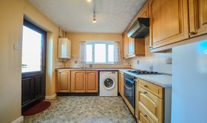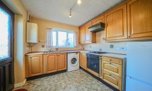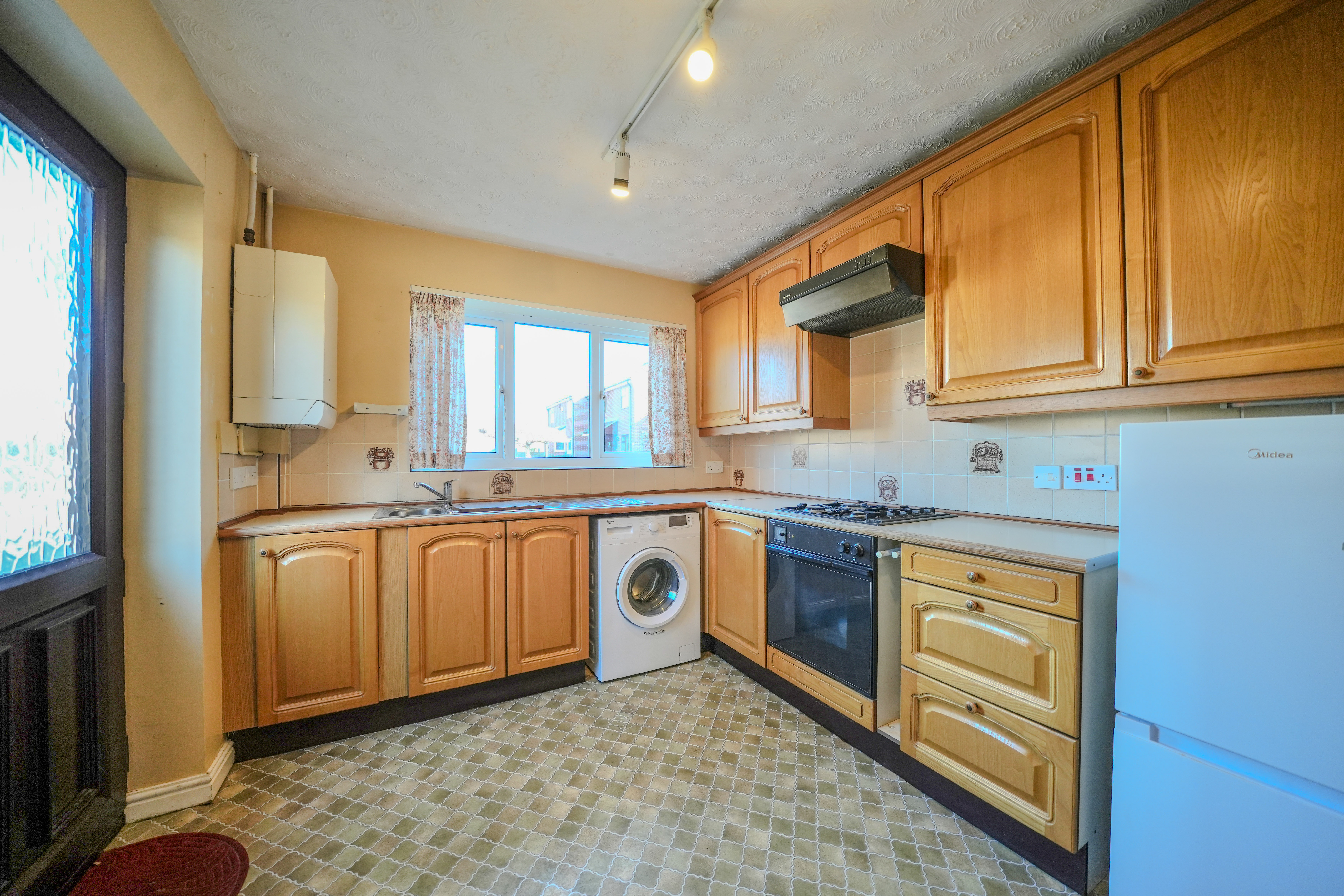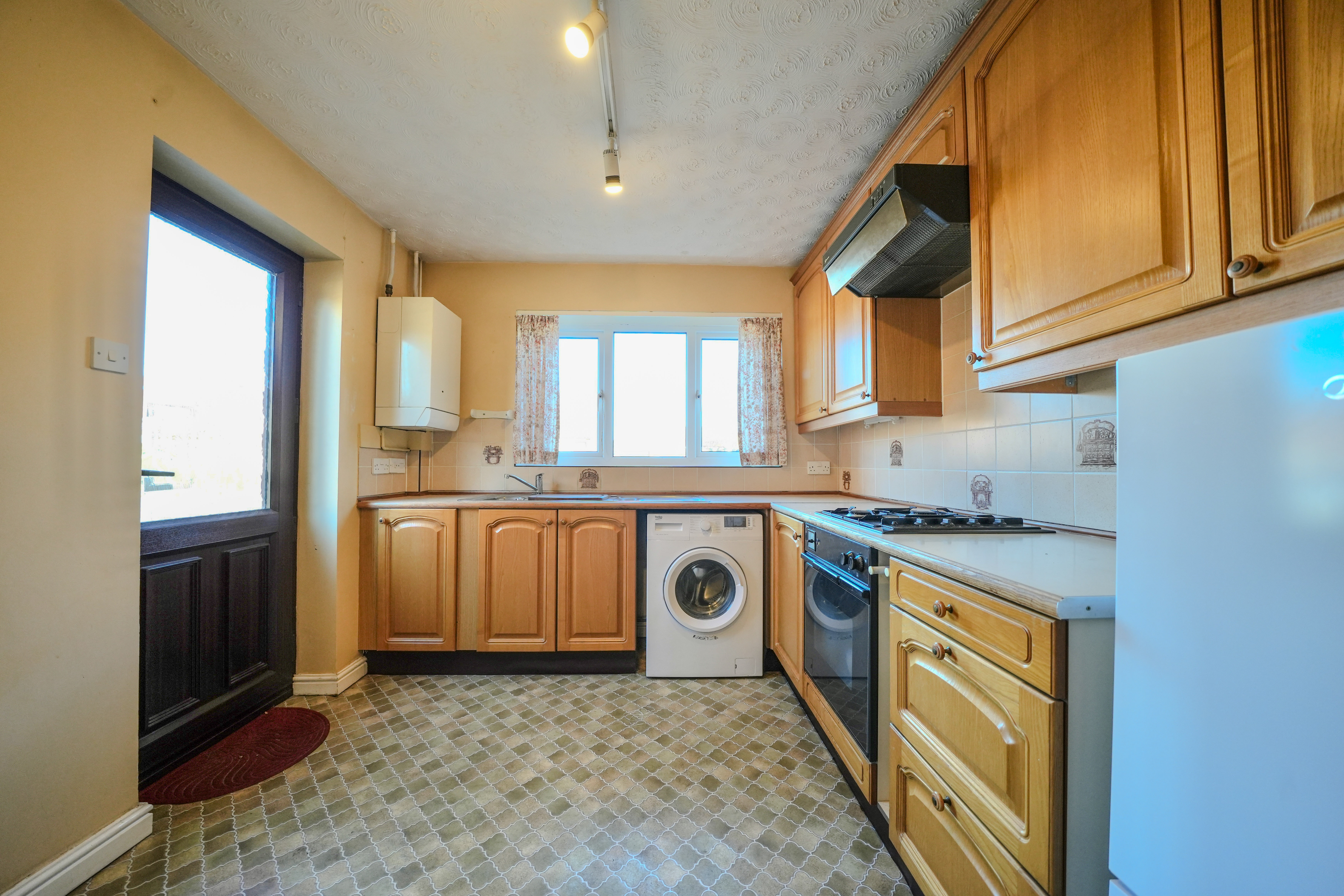 uPVC double glazed window to the front aspect, a range of fitted base and wall mounted units with work surfaces over, inset stainless steel sink with side drainer, inset four-ring gas hob with filter hood over, tiled splashbacks, built-in oven, space and plumbing for washing machine, space for fridge freezer, wall mounted gas fired boiler, wall mounted radiator, vinyl type flooring and uPVC part double glazed entrance door to the side aspect.