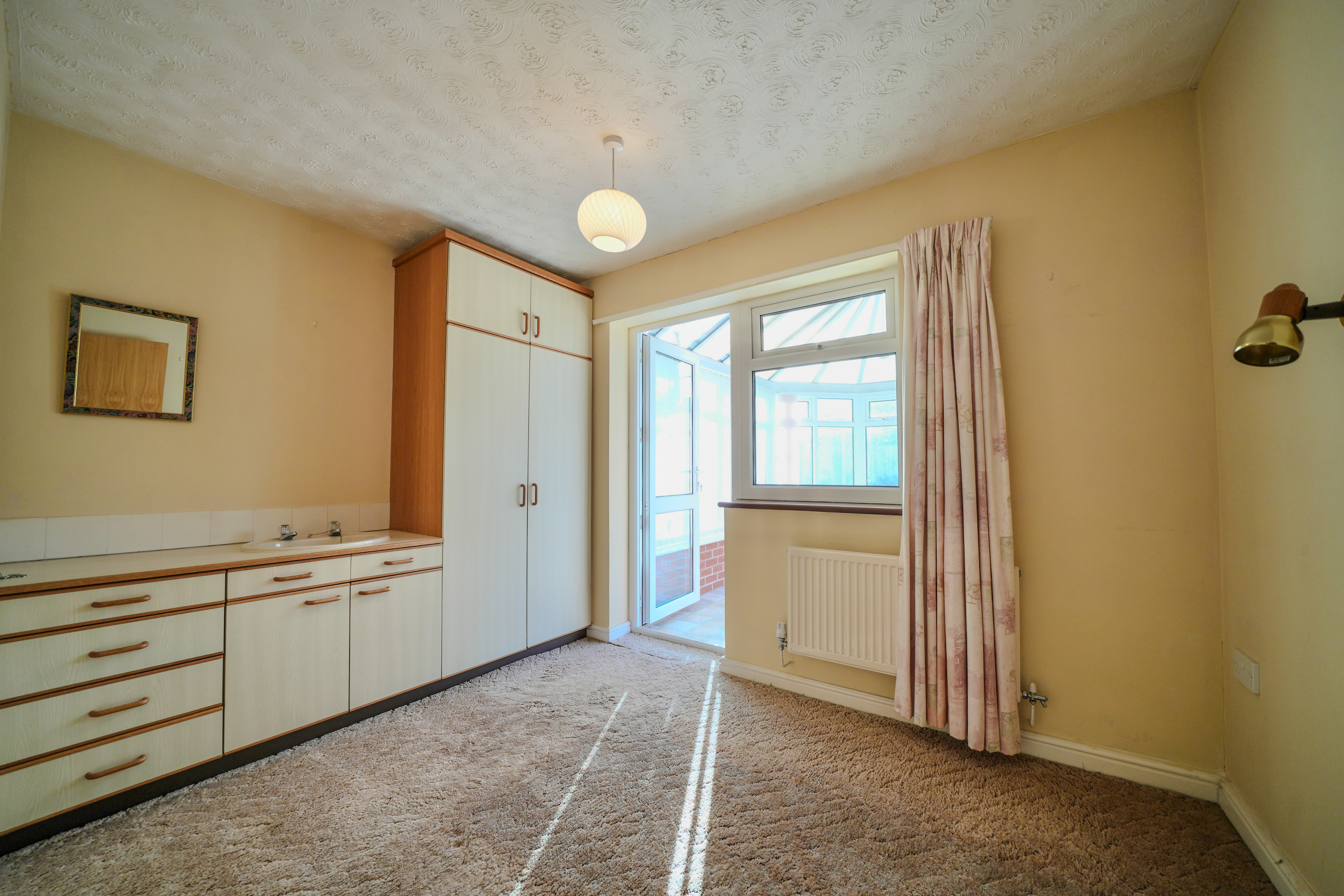 uPVC double glazed window to the rear aspect, carpeted flooring, wall mounted radiator, fitted wardrobes and drawer units with inset wash hand basin and uPVC double glazed door to the conservatory.