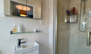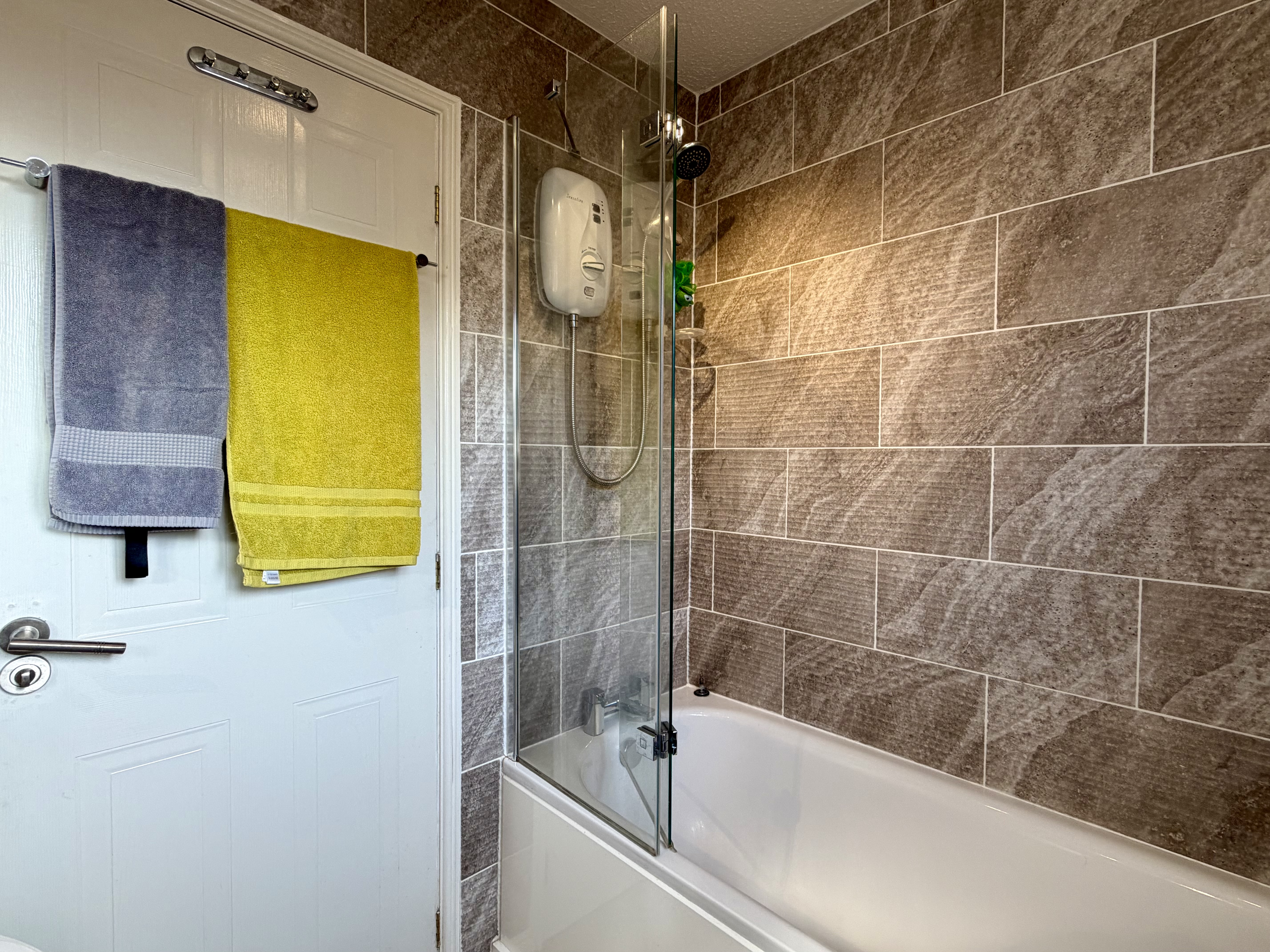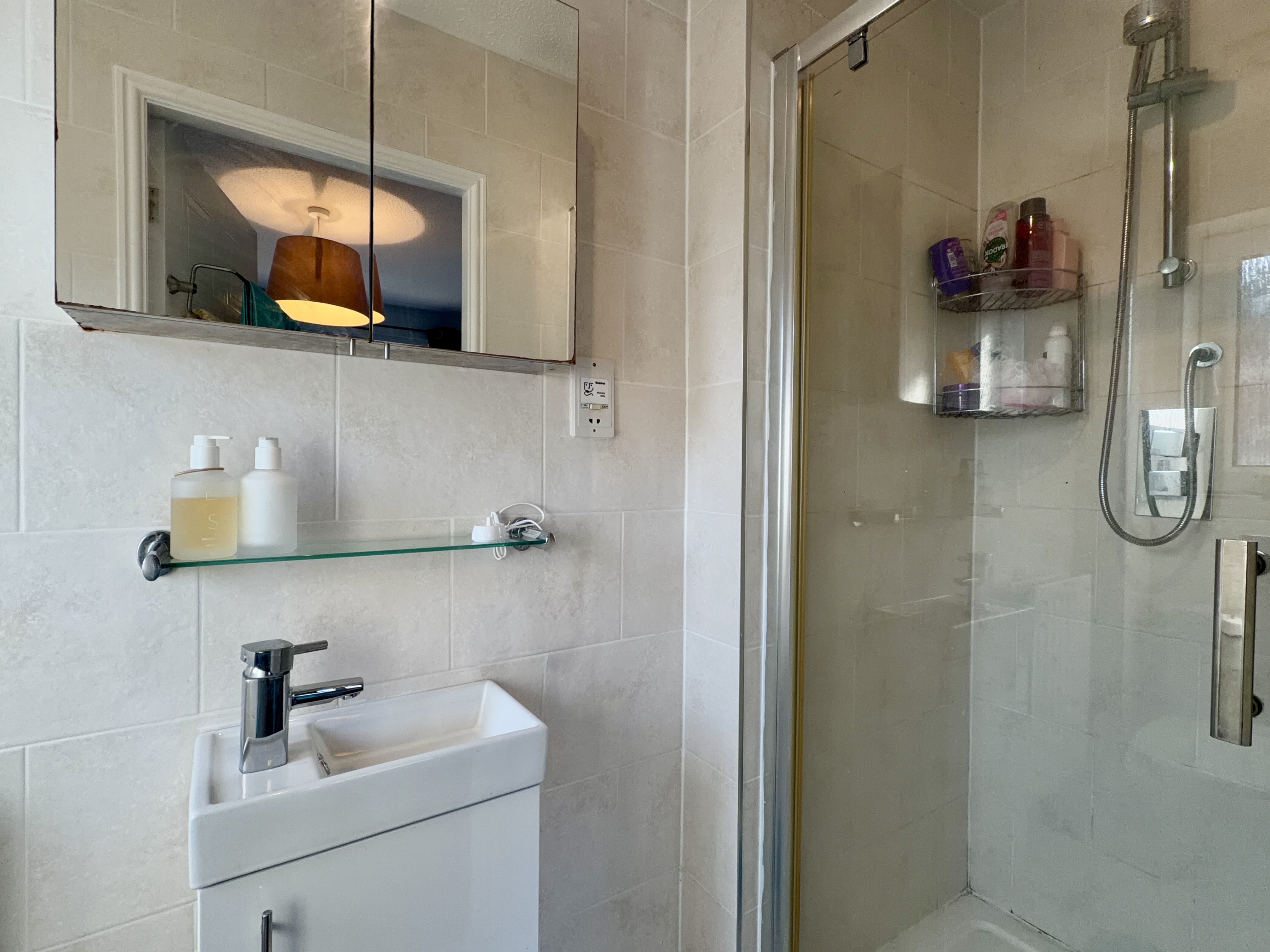 - Beautiful modern and fully tiled bathroom with shower over the bath and a large fitted mirror