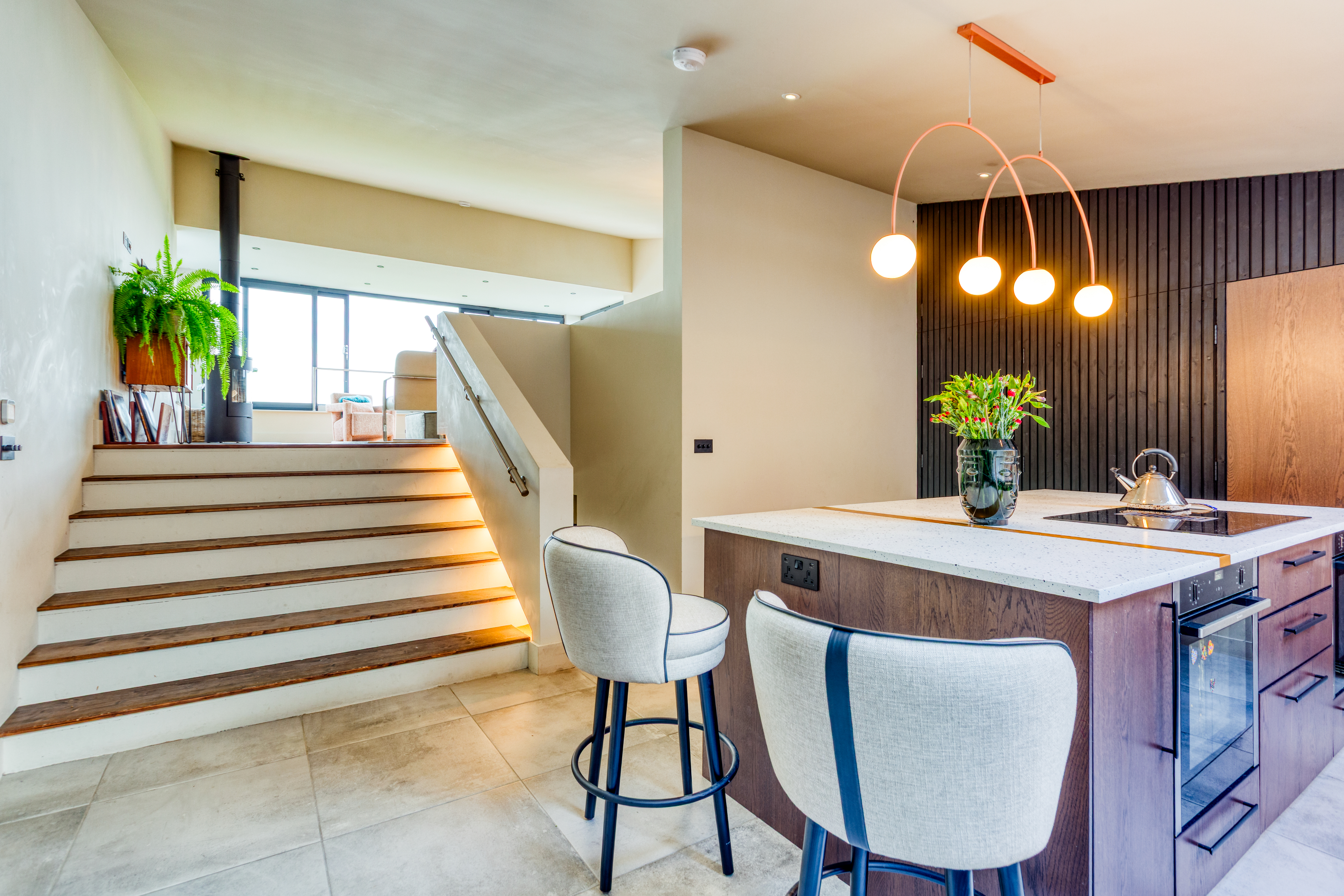 Inside, the accommodation features three bedrooms and two modern bathrooms, all finished to a high standard. The hi-spec kitchen/breakfast room is ideal for relaxed everyday living, while the elegant living/dining room enjoys wonderful views across the surrounding countryside. A wood-burning stove creates a warm and inviting focal point, making the space perfect for both entertaining and quiet evenings at home.