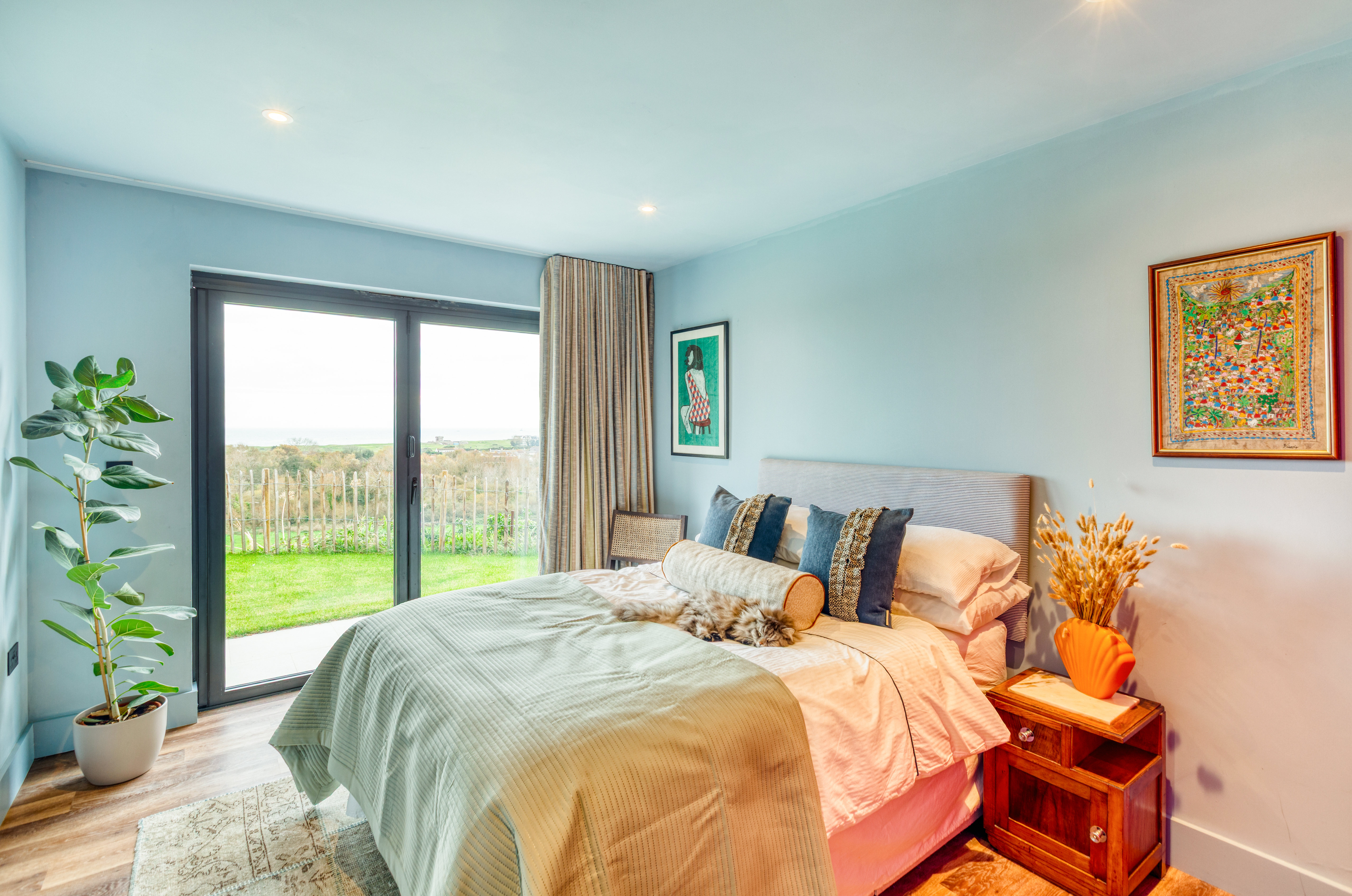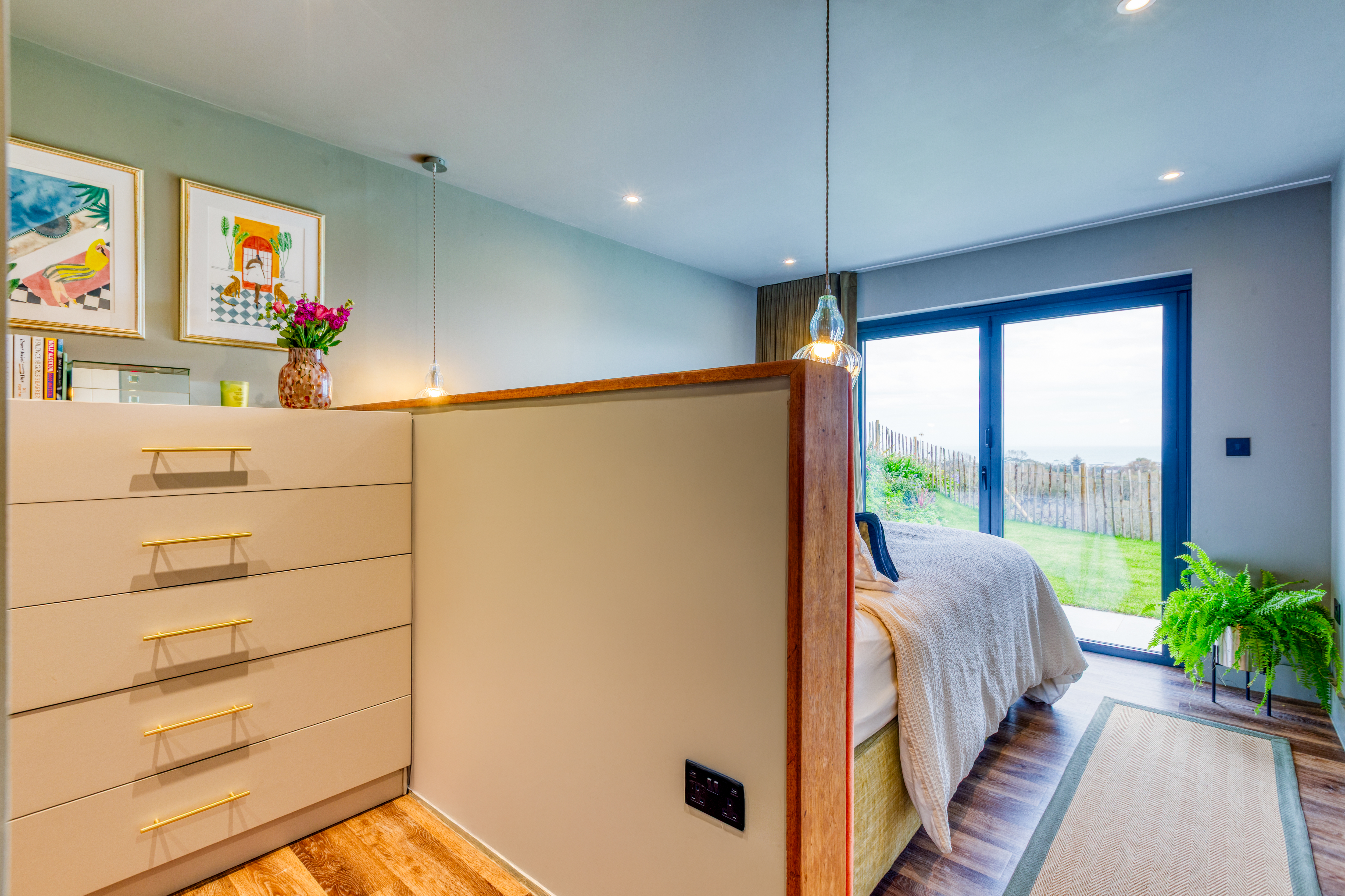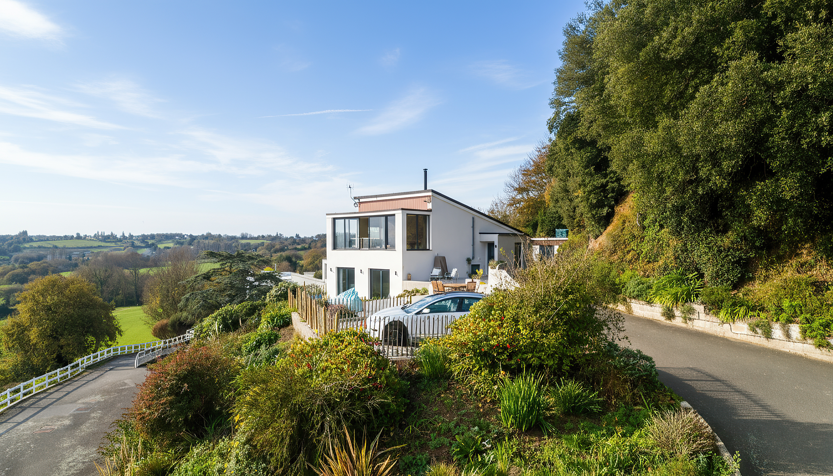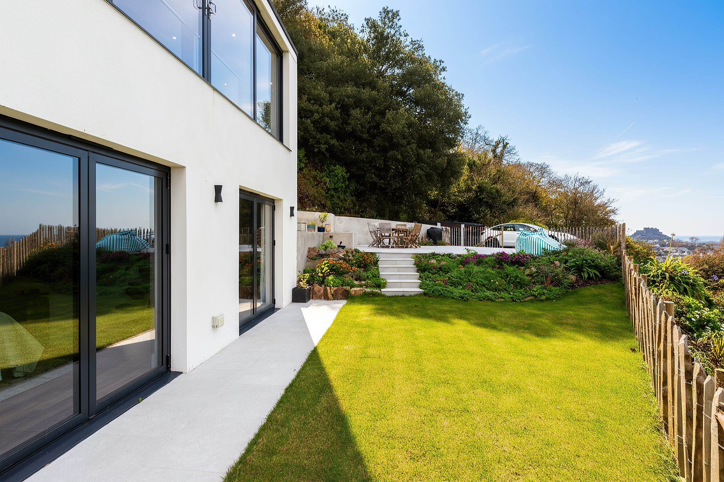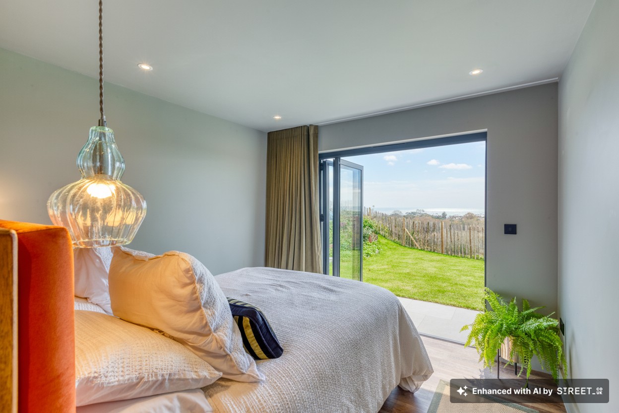 The garden is exceptionally well-manicured and thoughtfully arranged for effortless outdoor living. With sections of lawn and generous patio areas, it provides an ideal setting for enjoying all-day sun and taking in the spectacular views across the surrounding countryside and towards the coast. Whether hosting summer gatherings, enjoying family barbecues or simply unwinding in complete tranquility, this garden delivers an unrivalled level of scenic beauty.