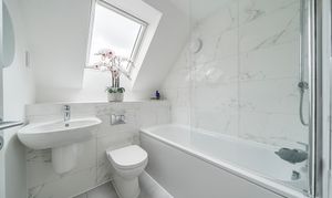 A family bathroom with smart grey tiling serves the other two bedrooms.