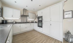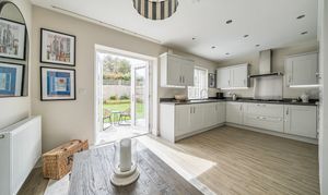 At the rear the open plan kitchen/dining area is a true highlight of the property. The kitchen itself is stunning; it features a range of cream cabinetry paired with striking dark worktops. Integrated appliances include twin eye-level ovens, full height fridge/freezer and 5 burner gas hob together with a dishwasher.