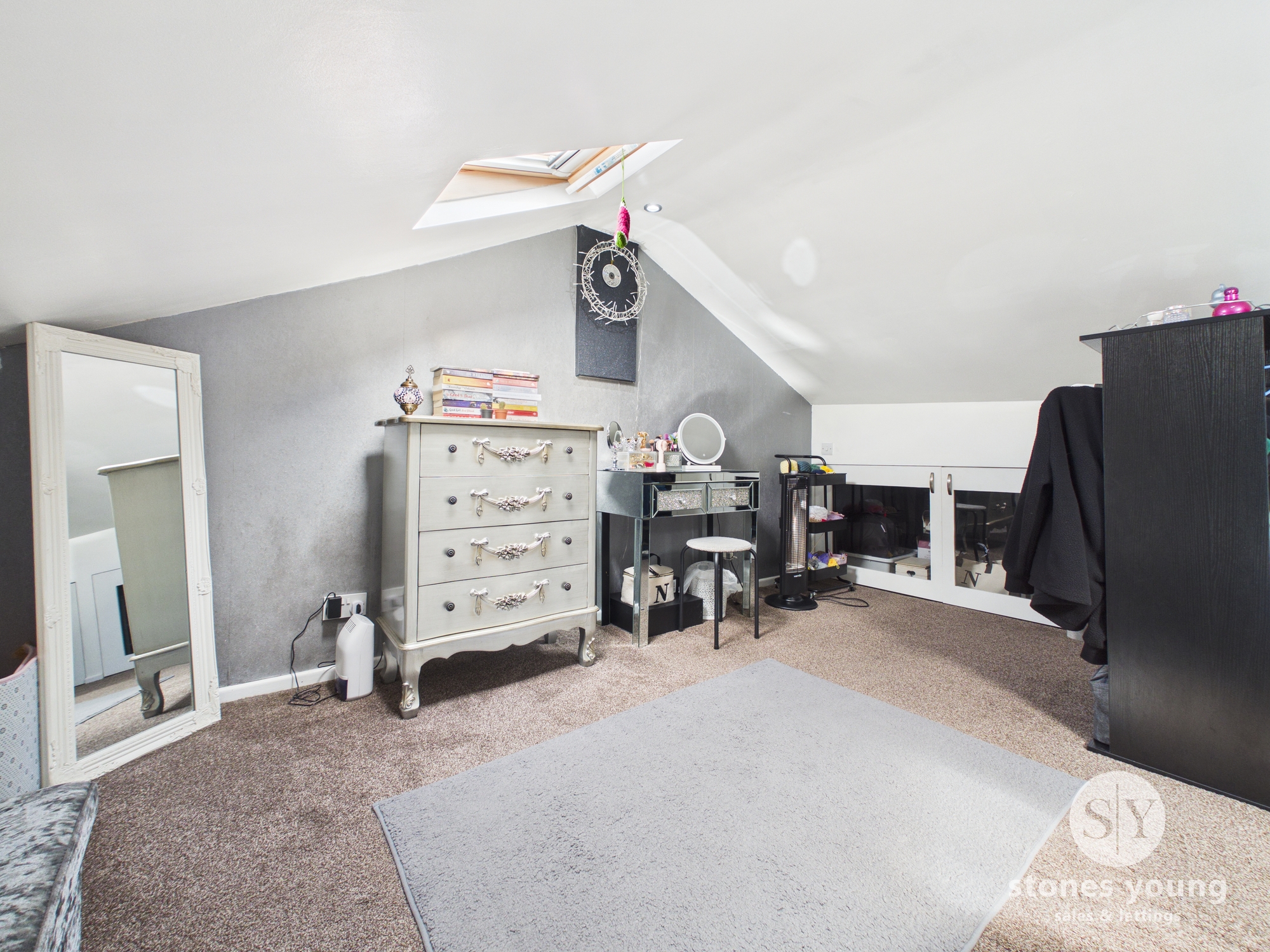 Carpet flooring, panel radiator, storage cupboard, media wall with electric fire, upvc double glazed window