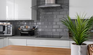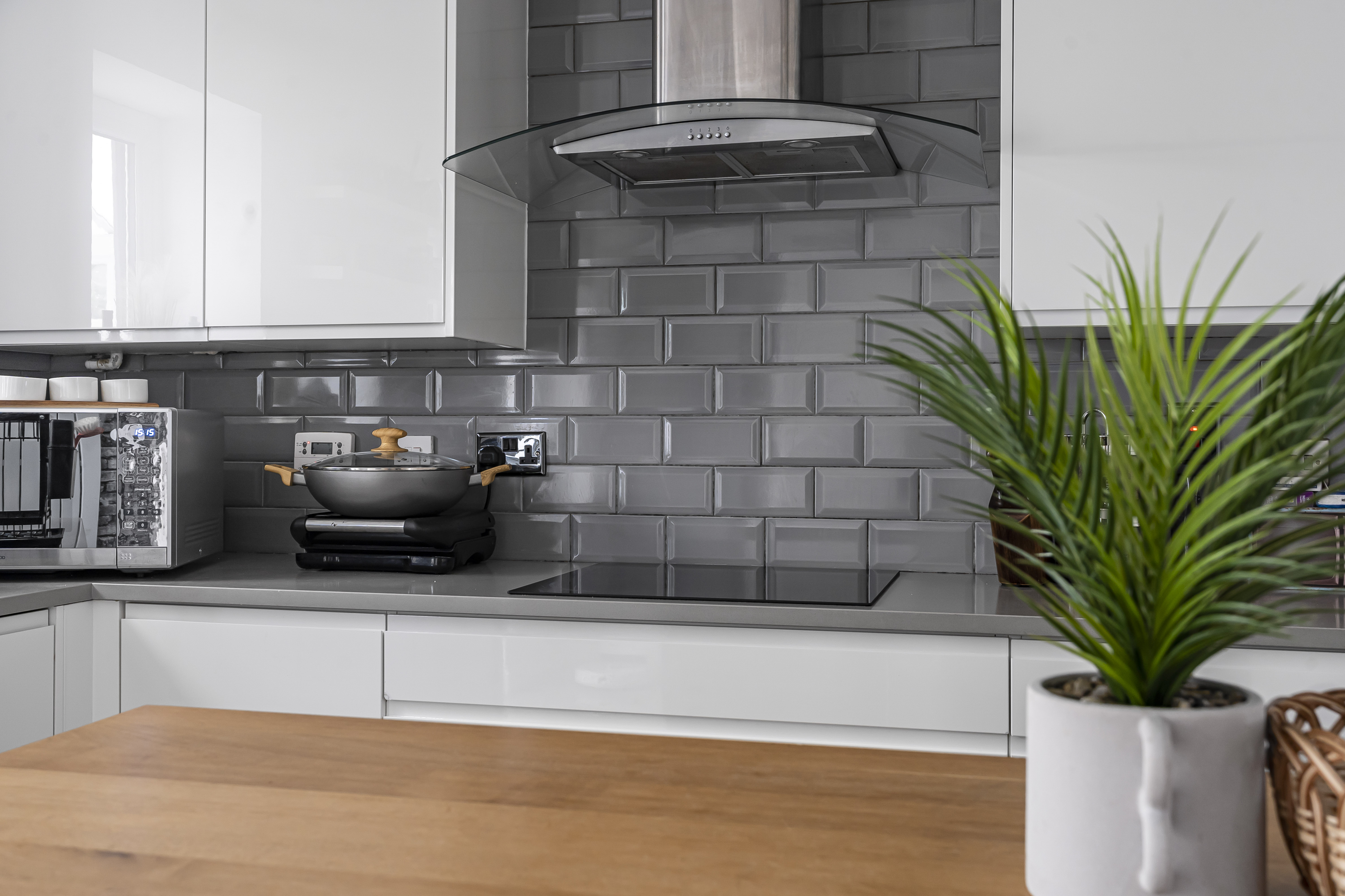 A large kitchen fitted with a high specification range of wall and base mounted cupboard units either inset LED lick board lighting and a range of integral appliances including a four ring induction hob with extractor over, inset sink with a pull hose mixer tap, twin electric ovens, full height fridge and freezer, dishwasher and washing machine. The flooring is fully tiled and a window overlooks the rear.
