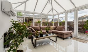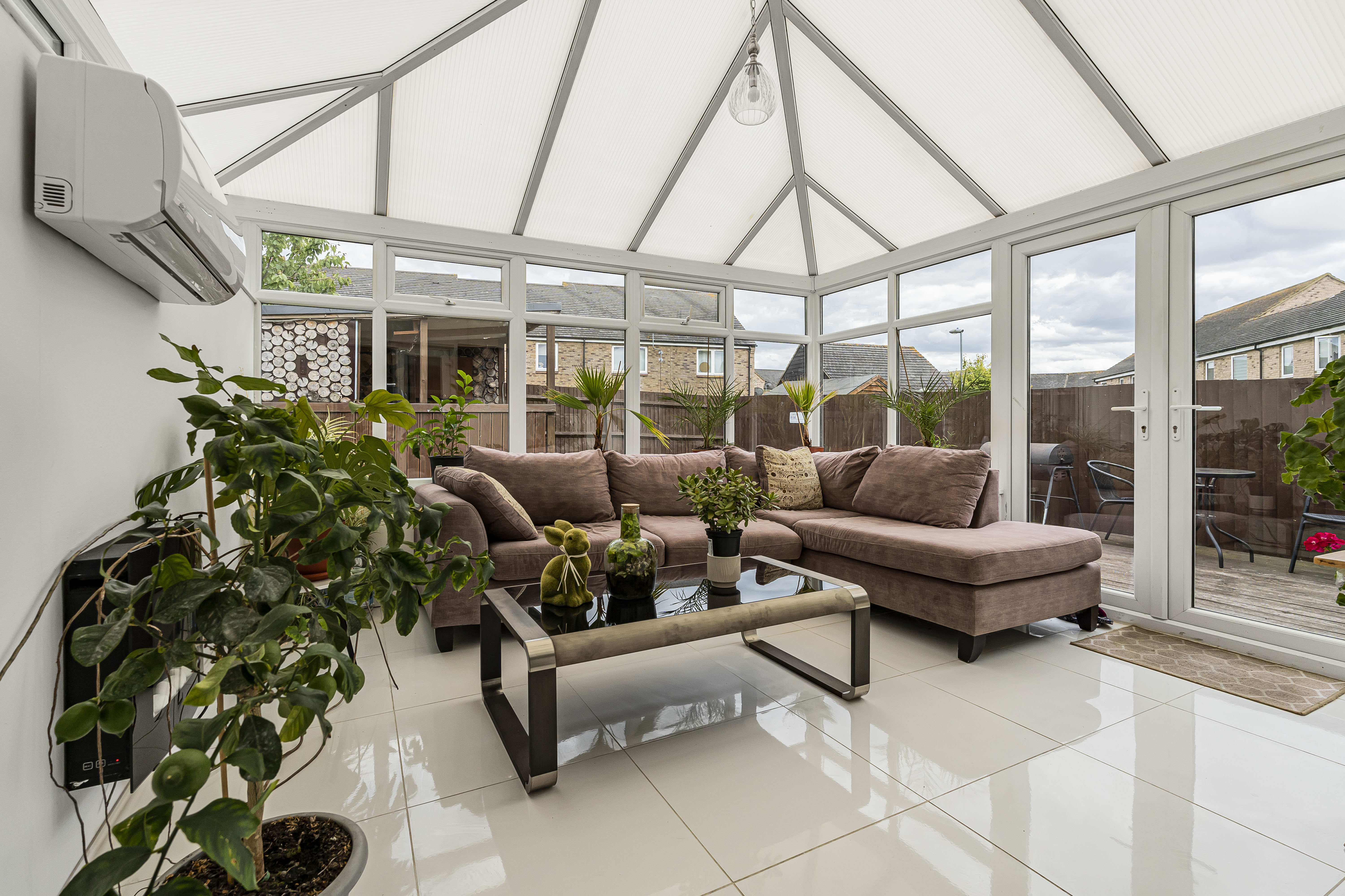 A large UPVC conservatory with a pitched polycarbonate roof and doors to the garden. An air conditioning unit provides warm and cold air with a separate electric heater as well and fully tiled flooring.
