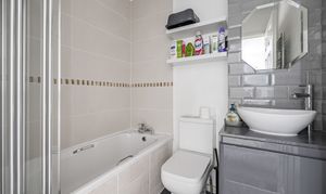 Fitted with a stylish suite comprising panelled bath with electric shower over, close coupled WC and a wash hand basin with vanity storage underneath. The surrounds are tiled, tiled flooring and there is an extractor fan.