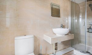 A contemporary WC fitted with a close coupled WC and a wash hand basin.