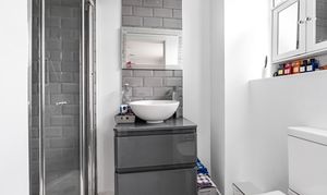 A contemporary guest en-suite fitted with a three piece suite comprising shower cubicle with shower over and tiled surrounds, low level WC and a wash hand basin with vanity cupboards. The floor and surrounds are tiled, there is a window to the front and an extractor fan.