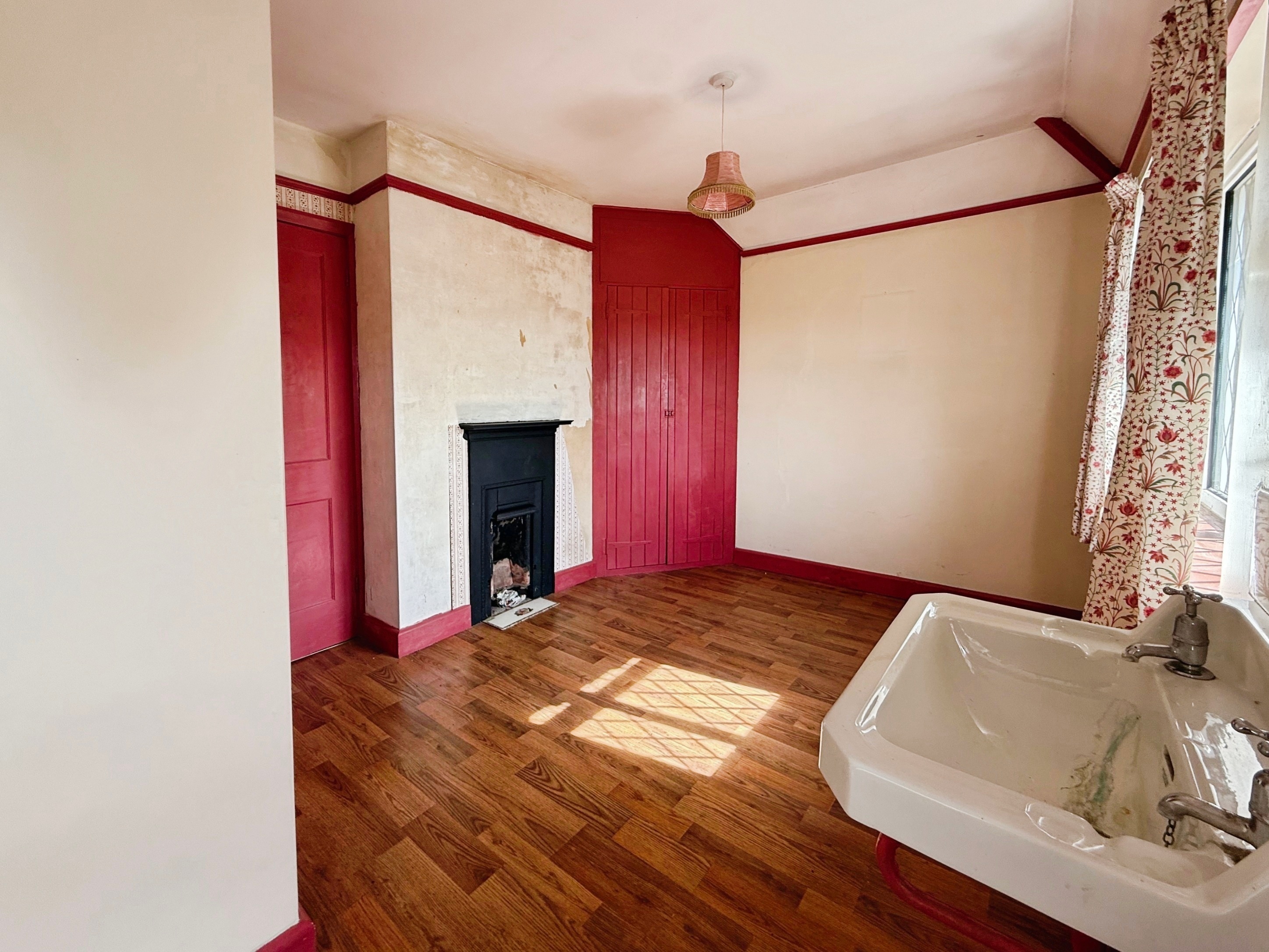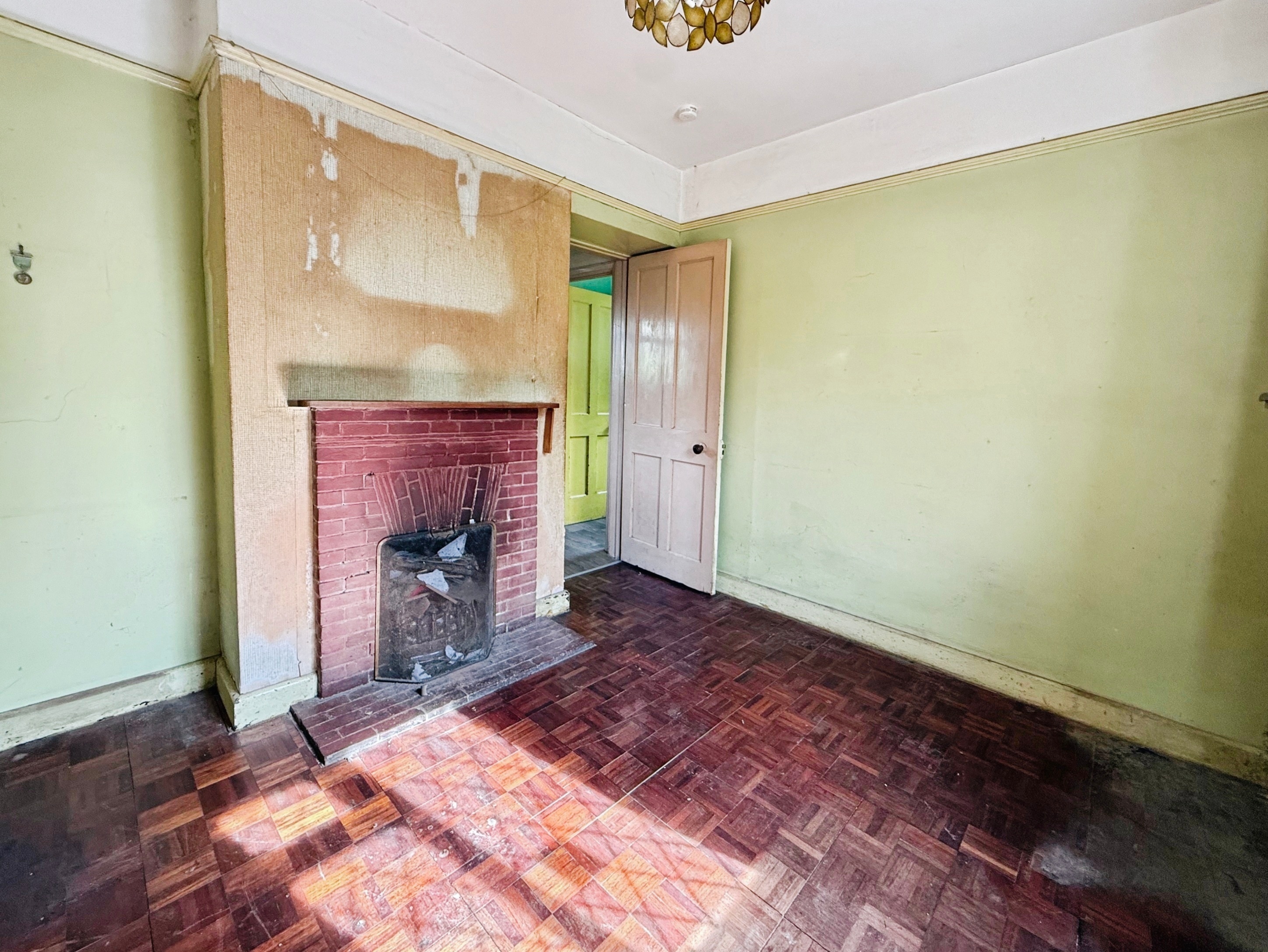 Parquet flooring, double glazed window to front, brick fireplace with open fire, radiator. Door to: