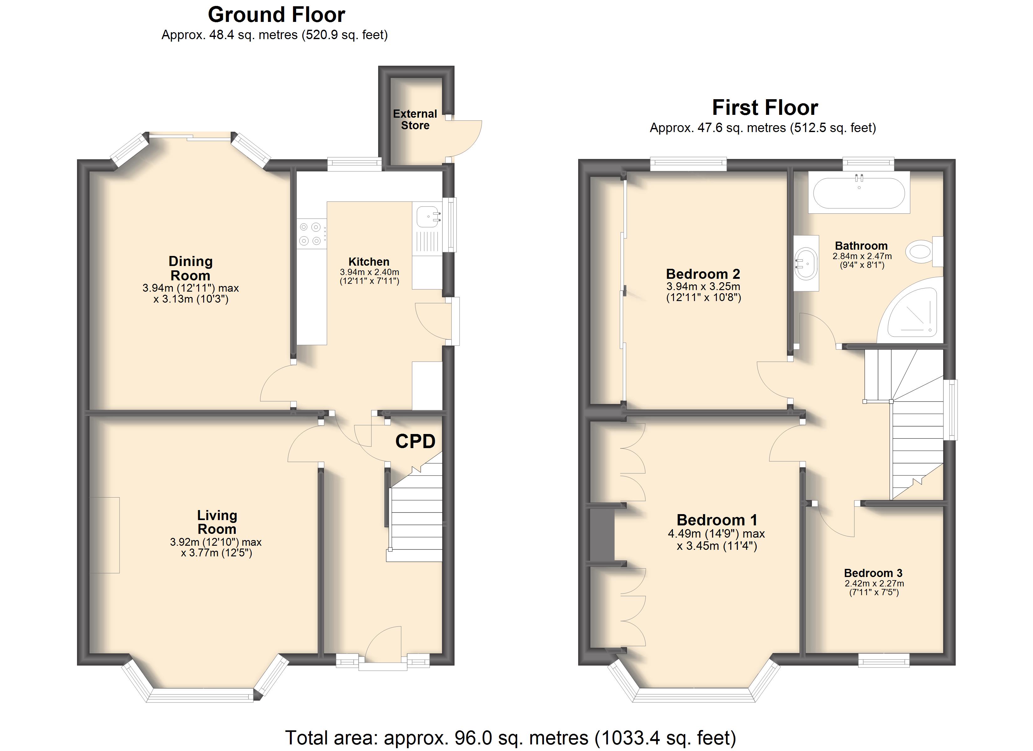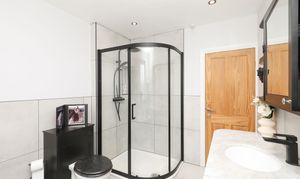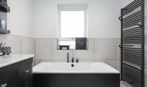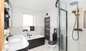 Upstairs, the home hosts three well-proportioned bedrooms, two of which benefit from built-in wardrobes. The third offers flexibility as a home office or nursery if desired. The elegant family bathroom is a valid focal point, finished with great attention to detail and featuring a stunning four-piece suite, including a separate shower and a freestanding bath.