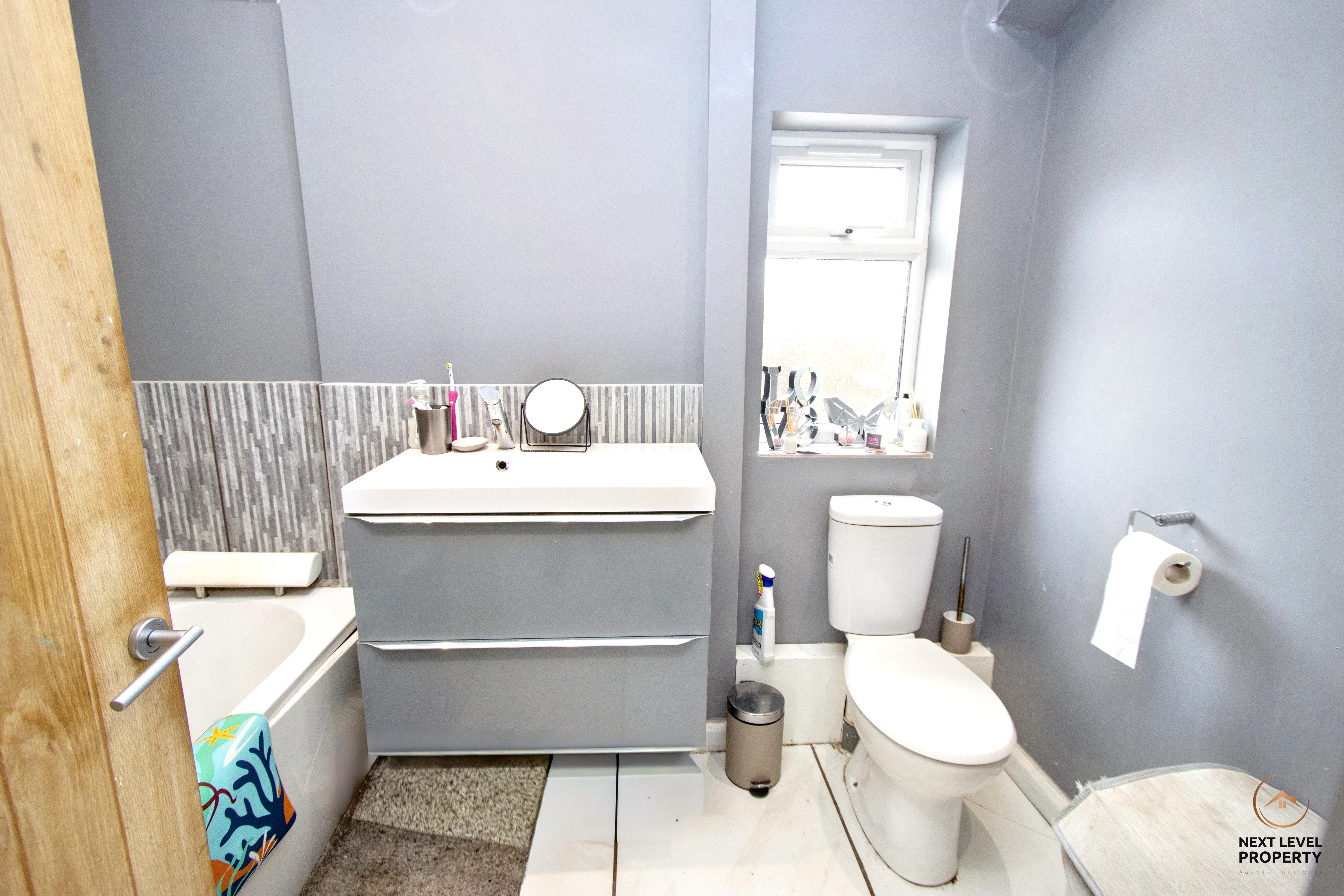 The bathroom is fitted with a jacuzzi bath, creating a perfect space to unwind, along with a ceramic sink set within a useful storage unit and a close-coupled WC. Tiled splashbacks add a practical finish, while UPVC windows to the side and rear provide natural light and ventilation.
