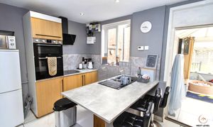 The kitchen is well-fitted with a range of storage units and generous worktop space, incorporating a built-in double oven, ceramic hob with cooker hood over, and additional space for appliances. A breakfast bar adds a sociable touch, ideal for casual dining or morning coffee. Finished with tiled splashbacks and a ceramic tiled floor, the space is both practical and easy to maintain. A UPVC window overlooks the rear, while doors lead through to the conservatory and the bathroom, enhancing the home’s overall flow.