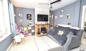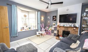 The lounge is a comfortable and inviting living space, featuring a ceramic tiled floor and a charming fireplace with open fire, creating a natural focal point. A UPVC window to the front allows for plenty of natural light, while a useful understairs storage cupboard adds practicality. A door leads through to the kitchen, keeping the layout nicely connected.