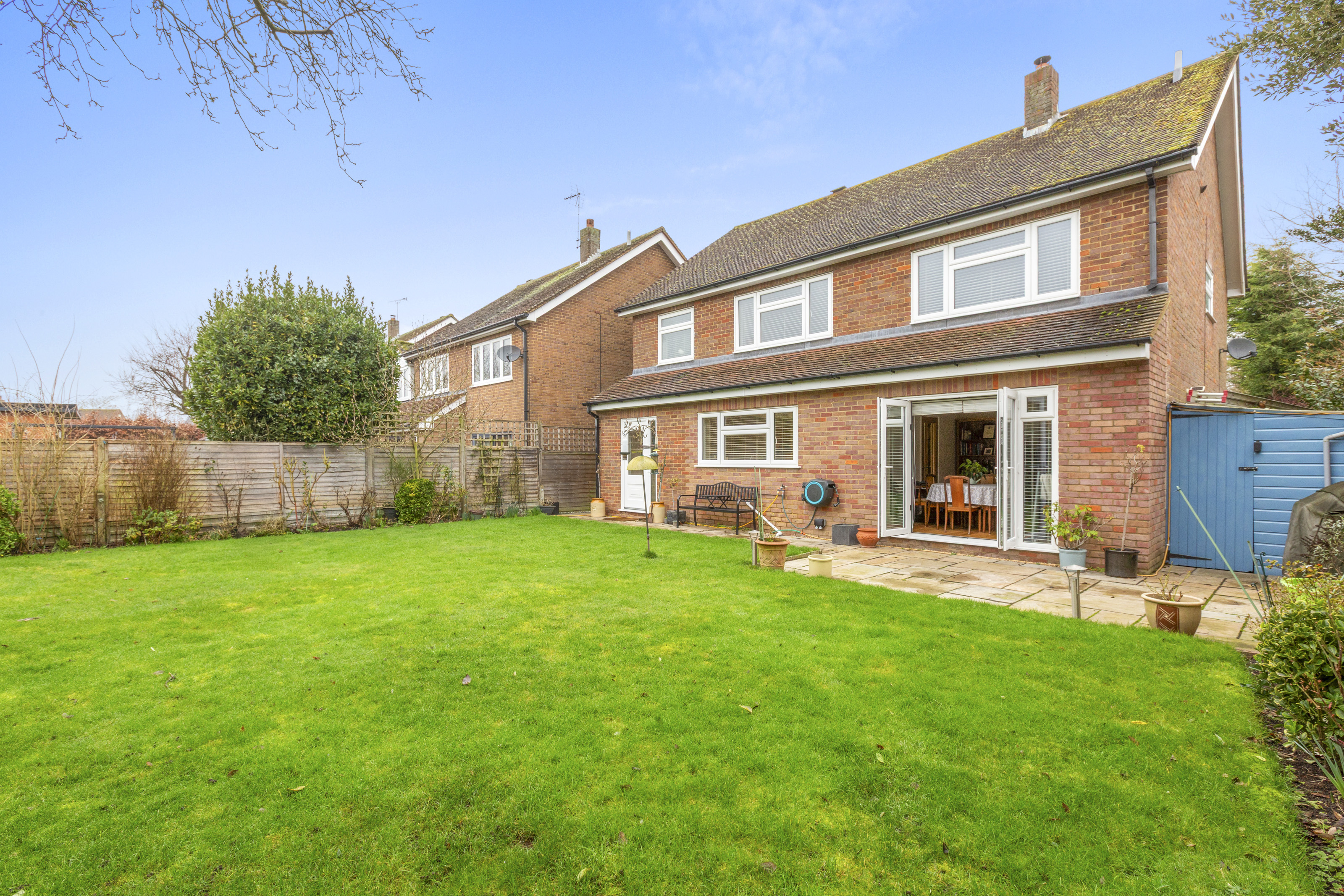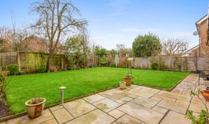The front of the property is a lawned area and a block paved driveway giving parking for 3-4 cars which leads to the garage and front door where an electric car charger can be found. There is access to the rear garden via a side gate where a path leads to a patio abutting the rear of the property. The sunny, southerly facing rear garden is laid to lawn with borders containing trees and mature shrubs. To the other side of the property a useful storage shed has been built.