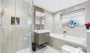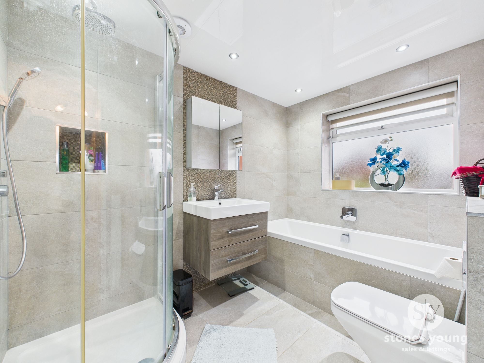 Tiled flooring, four piece in white comprising of bath, basin, wc and walk in shower enclosure, ceiling spot lights, tiled floor to ceiling, frosted double glazed uPVC window, towel radiator.