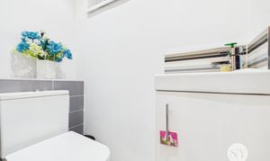 Karndean flooring, two piece in white comprising of wc and basin, tiled splash backs, ceiling spot lights, frosted double glazed uPVC window, towel radiator.