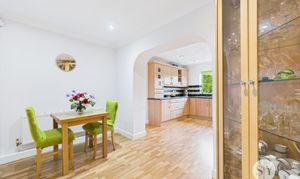 Laminate flooring, ceiling coving, ceiling spot lights, archway into the kitchen, panel radiator.