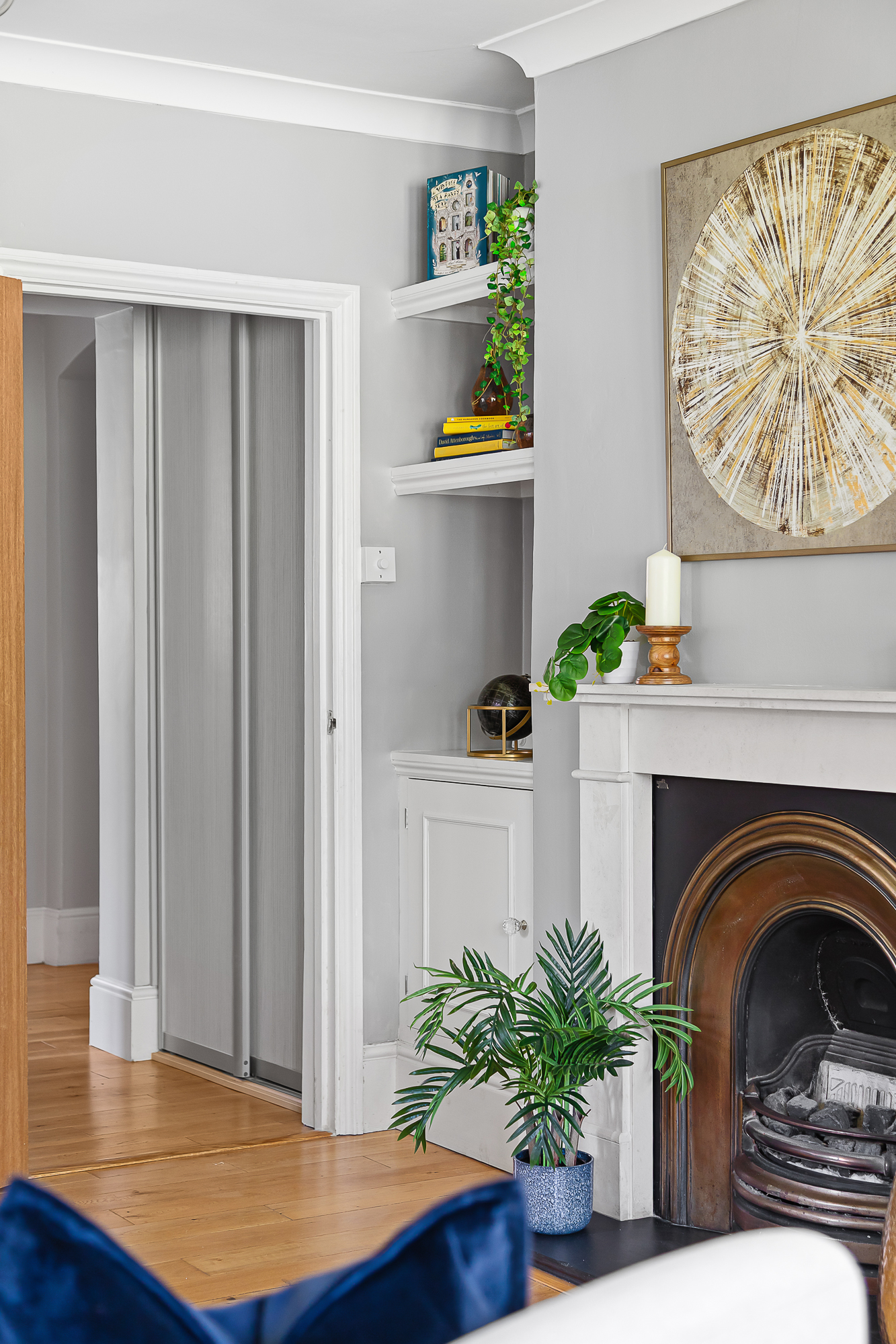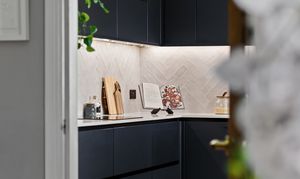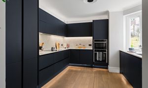 The kitchen sits separately to the rear of the flat. Deep navy cabinetry runs along two walls with integrated appliances, pale worktops and a herringbone tiled splashback. The large bay window above the sink looks out across the gardens behind the building and towards the trees of the park beyond. It’s a truly impressive space and will work for both those who prefer to enclose cooking smells and those who prefer a more social open layout, as the kitchen is adjacent to the reception space.