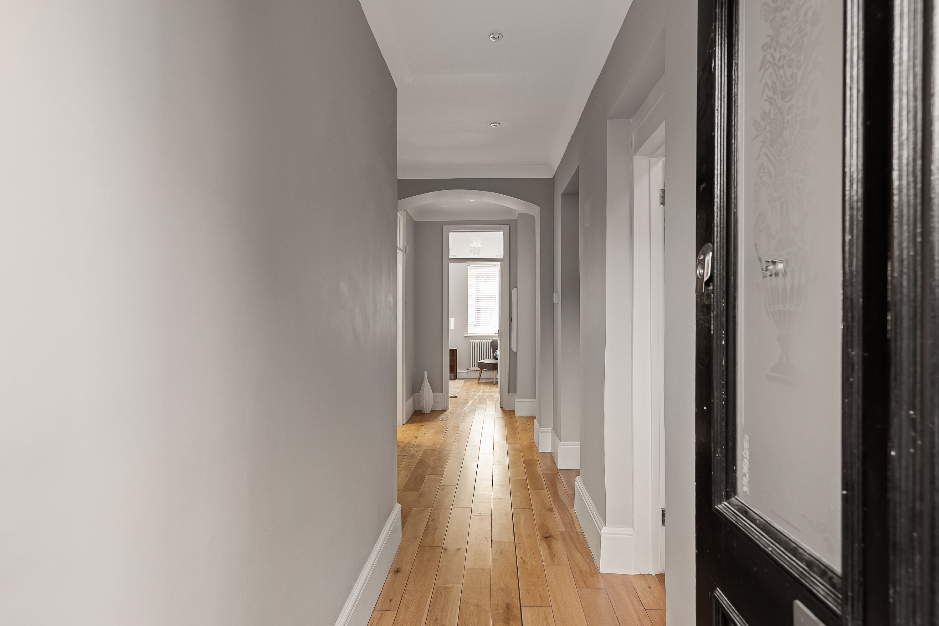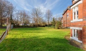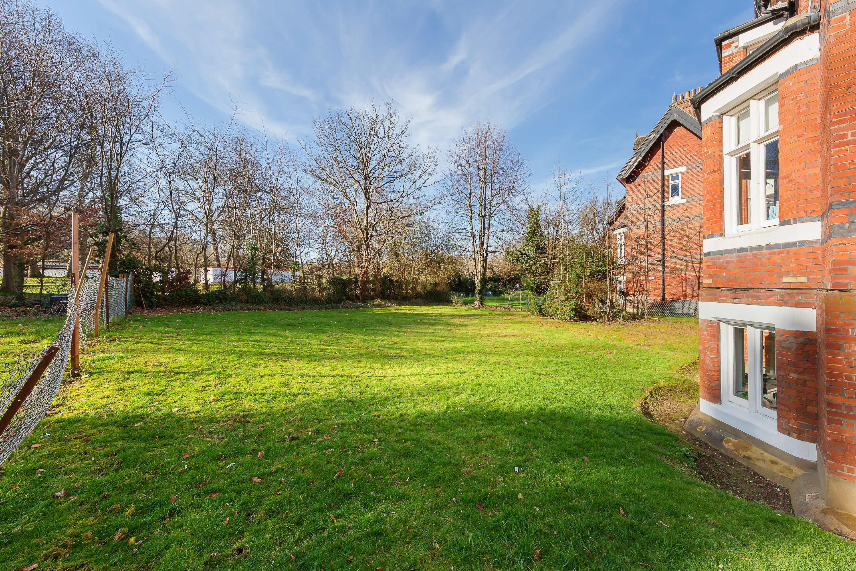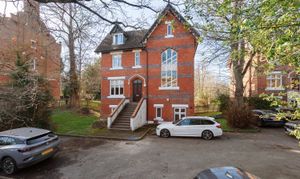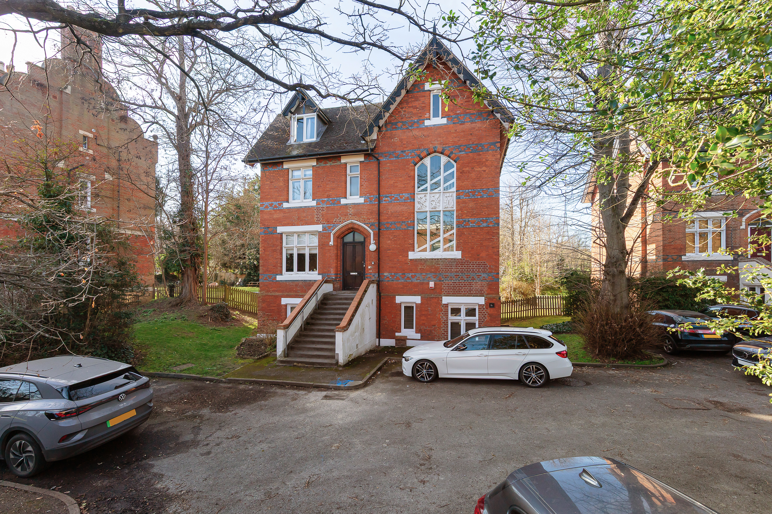 The building itself is a substantial Victorian structure with red brick elevations and tall windows. It sits within mature grounds and, given its position alongside the park, the setting feels particularly green and open. The flat is entered through its own private entrance, which leads to a central hallway that gives access to all the main rooms.