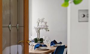 The reception room overlooks the gardens and measures just under eighteen feet across. It’s a comfortable space that easily accommodates both a sitting area and a dining table, without compromise. The ceiling height and window size typical of buildings from this period give the room a good sense of volume and plenty of natural light.