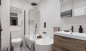 The bathroom has been recently updated, and is finished with large-format tiles, a bath with rainfall shower above and a wide vanity unit providing useful storage. A secondary WC can be found off the hall, which is handy when entertaining.