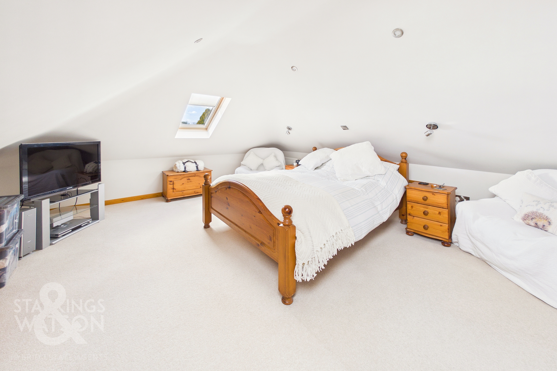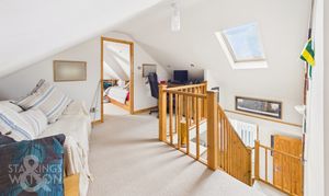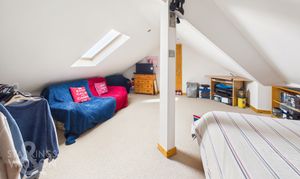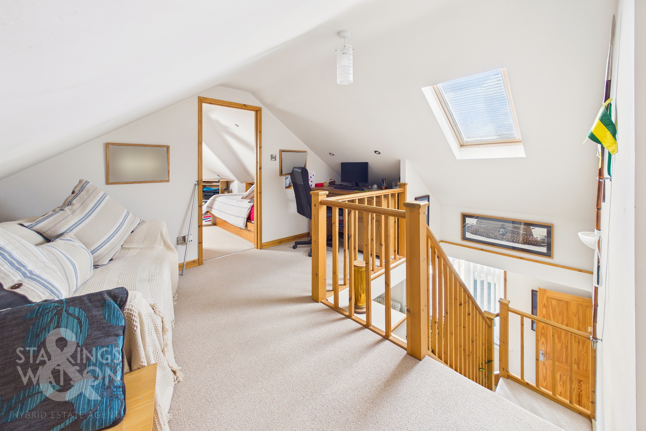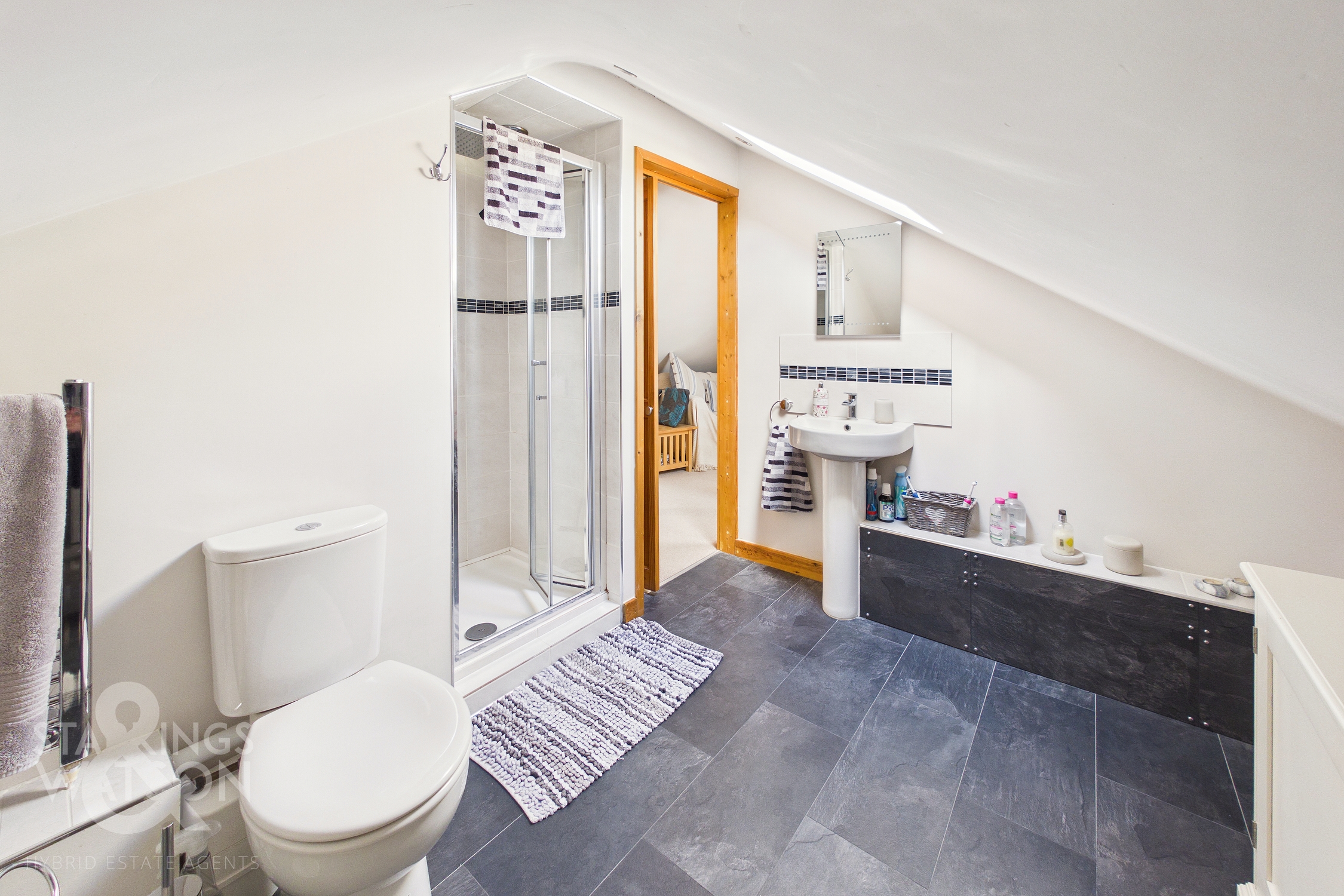 Heading upstairs, the large galleried landing offers a velux window to front providing an ideal home office or study space, with built-in storage, and doors leading off to two bedrooms. The rear facing bedroom enjoys a range of velux windows for natural light with fitted carpet underfoot. The second bedroom is finished in a similar style and design with a velux window and door to a loft storage area. A first floor shower room can be found with a white three piece suite including a walk-in shower cubicle with tiled splash-backs and tile effect flooring.