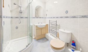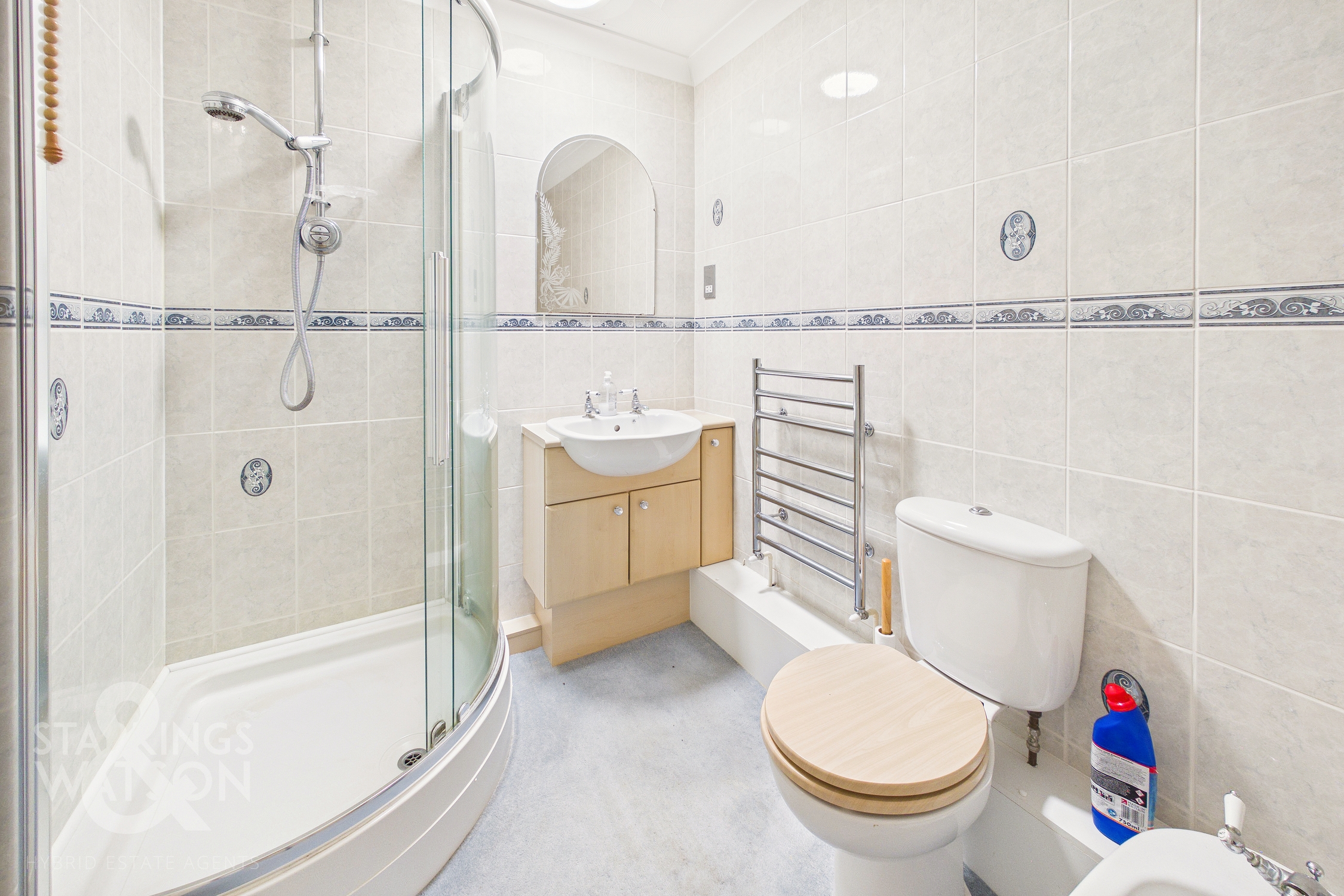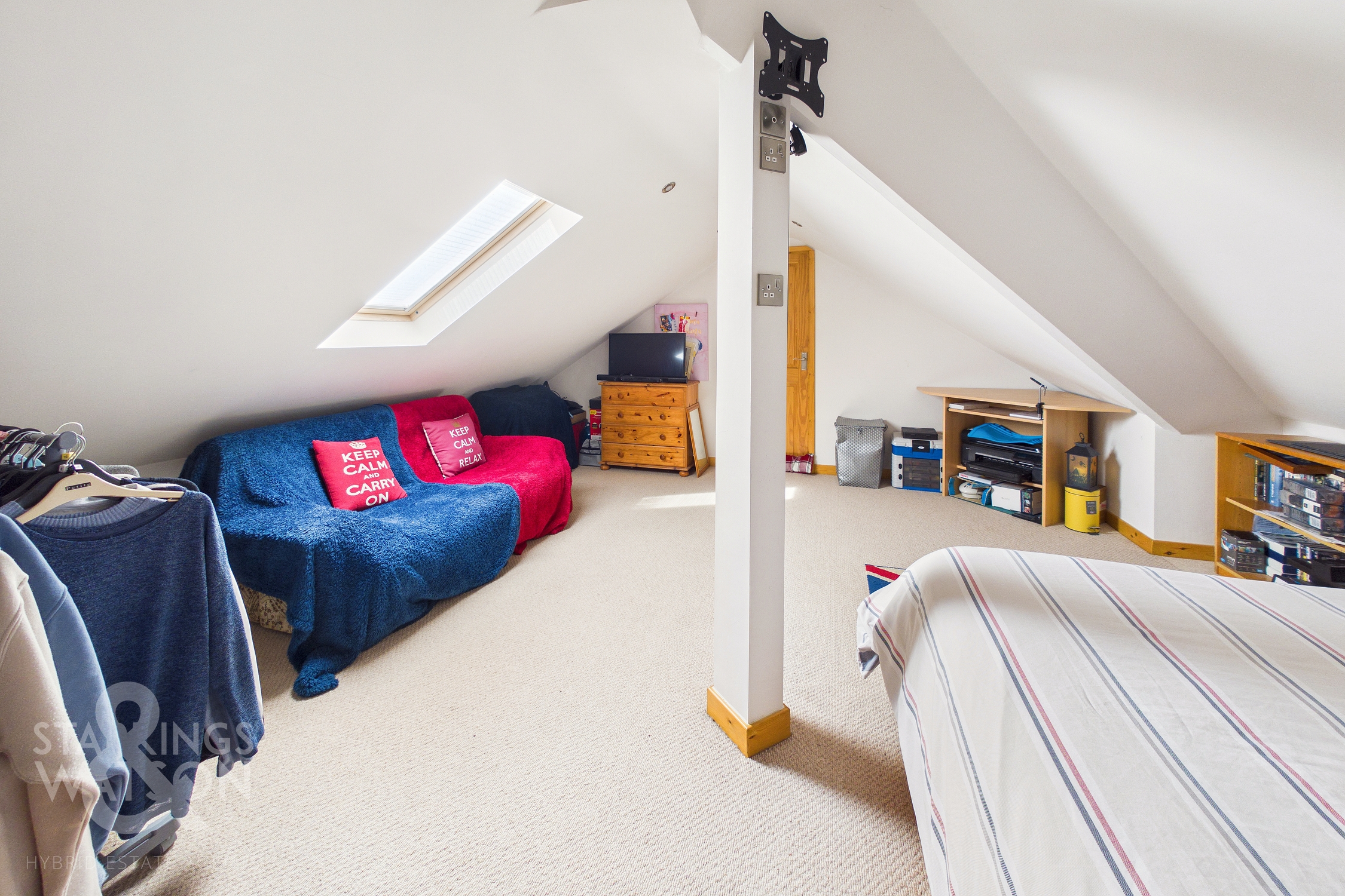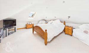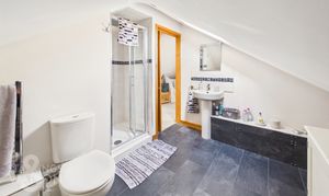 Heading upstairs, the large galleried landing offers a velux window to front providing an ideal home office or study space, with built-in storage, and doors leading off to two bedrooms. The rear facing bedroom enjoys a range of velux windows for natural light with fitted carpet underfoot. The second bedroom is finished in a similar style and design with a velux window and door to a loft storage area. A first floor shower room can be found with a white three piece suite including a walk-in shower cubicle with tiled splash-backs and tile effect flooring.