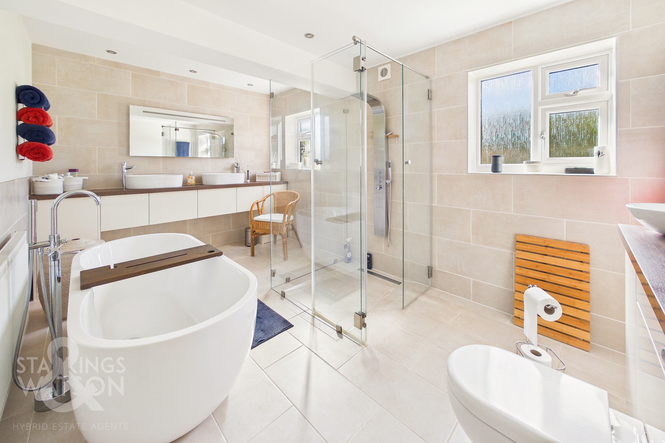 Heading inside the hall entrance greets you with wood effect flooring underfoot and stairs rising to the first floor galleried landing. A front facing window floods the room with excellent natural light, with doors leading off to the ground floor bedroom accommodation, dining room and formal sitting room. The sitting room enjoys dual aspect views to front and side, with fitted carpet underfoot and a feature fireplace creating a focal point to the room. Full height windows and uPVC double glazed French doors open up to the raised timber deck seating area. Heading into the dining room which creates the heart of the home, this spacious entertaining room offers a further feature fireplace and wood effect flooring underfoot. Sliding patio doors open up to the conservatory whilst a door takes you to the kitchen. Having been updated and modernised to include a central island and solid wood work-surfaces, ample storage can be found throughout, with side facing windows and French doors flooding the room with excellent natural light. An inset ceramic butler sink is recessed within the central island which also forms a breakfast bar. Integrated cooking appliances include an inset gas hob with tiled splash-backs and an extractor fan, with a built-in eye level electric oven, built-in electric double oven and microwave combination. Integrated appliances include a wine cooler and dishwasher with doors leading off to the utility room and inner lobby. The utility room offers further matching storage with space for a washing machine and tumble dryer, tiled flooring flowing underfoot, whilst a side facing window and door lead out to the garden. The side lobby includes further storage space currently housing an American style fridge freezer, floor standing oil fired central heating boiler and built-in storage cupboard. A door takes you to the ground floor family bathroom, having been re-fitted and modernised to offer a luxury feel with a five piece suite including twin hand wash basins set within a large vanity unit, free standing rolled top bath with mixer shower tap and a walk-in shower cubicle with a thermostatically controlled twin head multi-jet shower with tiled splash-backs, heated towel rail and tile flooring. The conservatory extends the living space offering a variety of uses with further windows and doors taking to the rear garden. A snug room leads off the dining area with stripped wood flooring underfoot and a rear facing window providing a seamless link to the annexe if required. Finally. a ground floor bedroom leads off the hall entrance with stripped wood flooring, range of built-in storage units and uPVC double glazed window to front offering panoramic field views.