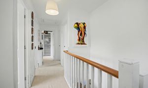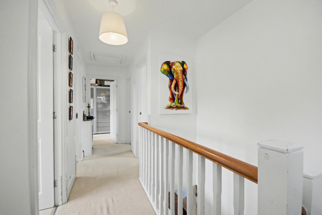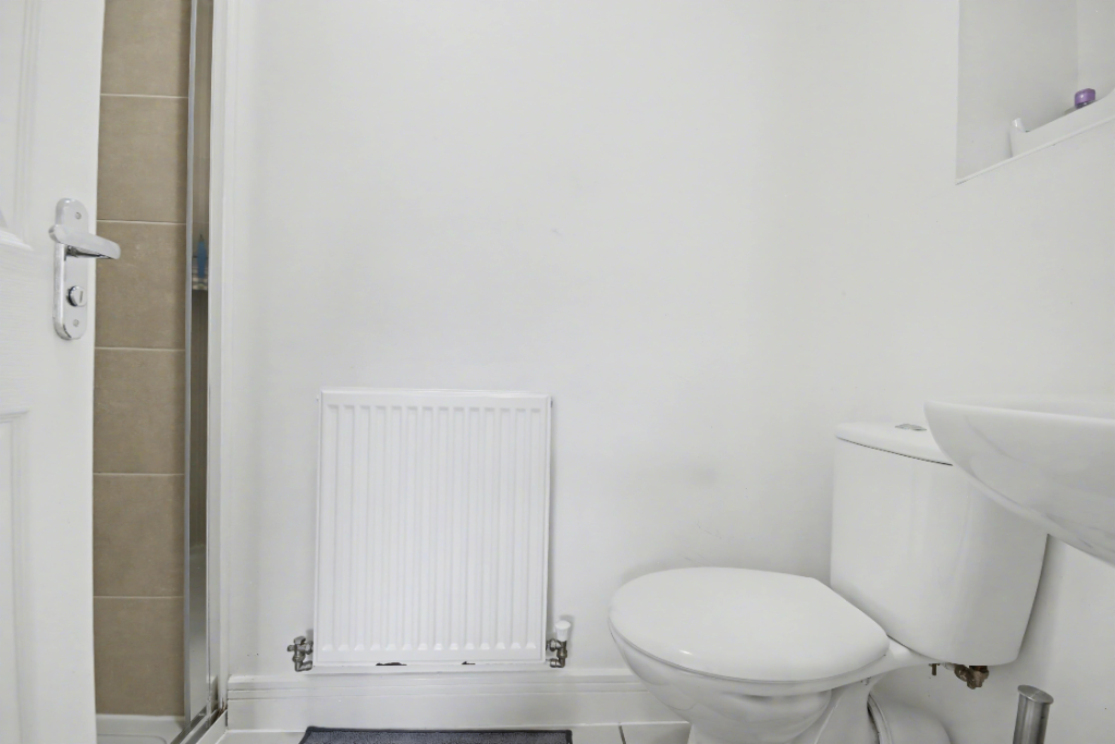 The living room is a generous space with a floor-to-ceiling UPVC double-glazed window, Amtico vinyl flooring, and enough room for multiple sofas and general living room furniture. The ground-floor study, accessed from the central entrance hallway, offers ample space for multiple workstations, making it ideal for professionals who work from home, either full-time or occasionally. The utility room includes a sink with a mixer tap, space for a washing machine, and storage for utility items and cleaning goods. A UPVC door brings light into the room and allows further garden access. The downstairs WC is off the utility room, tastefully decorated with aqua-green and white walls, featuring a pedestal white porcelain sink and toilet.