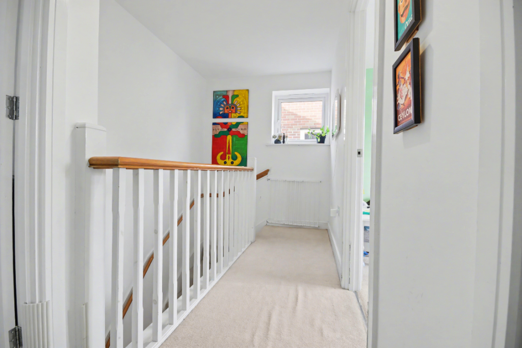 Upstairs, bedroom one at the front is a good-sized double with built-in sliding wardrobes and an immediately adjacent ensuite shower room containing a double shower, sink and toilet. Bedroom two, also at the front, is another good-sized double that makes a fantastic second bedroom. Bedroom three at the rear overlooks the private garden and features a light green feature wall. It's large enough to be a double bedroom and is currently laid out as a child's room. Bedroom four at the back also takes a double bed and is currently used as a wardrobe room. All bedrooms are carpeted with UPVC double-glazed windows and gas central heating radiators.