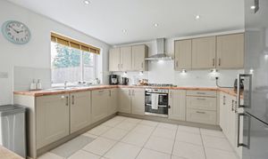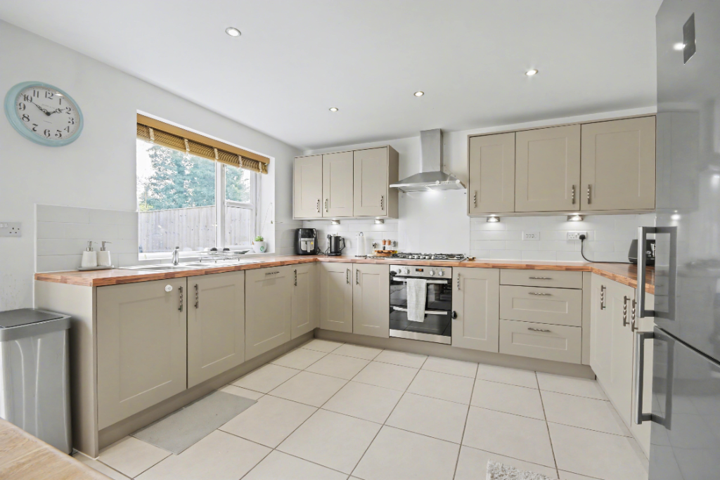 The ground floor layout is practical and well-proportioned. The bright, airy kitchen diner features soft grey shaker-style cabinets with walnut-effect worktops and light grey tiled splashback. It's equipped with a double sink, integrated dishwasher, integrated double oven, gas hob, and extractor fan. Ceiling spotlights and under-counter lighting keep the space well-lit, while large cream-coloured tile flooring is easy to maintain. Double patio doors open onto the decking for access to the south-facing rear garden, and there's onward access to the utility room. An under-stairs cupboard provides useful storage for day-to-day household items.