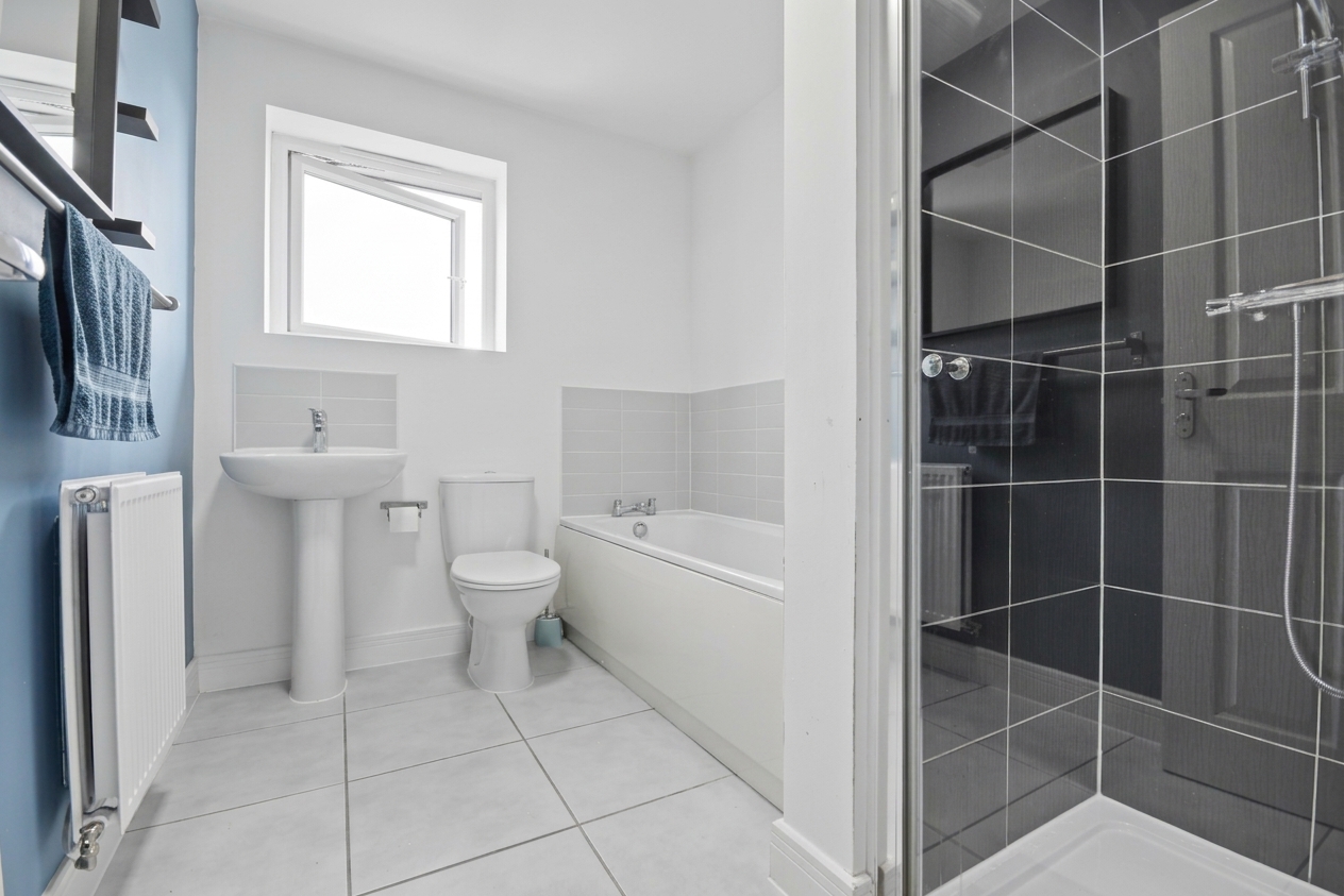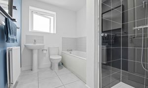 Features a tasteful mix of blues and greys, with light grey tiled flooring, light grey tiled splashback, and a navy blue feature wall. Darker grey square tiles in the separate shower unit create an attractive contrast. Gas central heating radiator, UPVC double-glazed window, pedestal white porcelain sink with mixer tap, white porcelain toilet, white bath and separate shower. Accessed from the first-floor landing.
