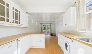 Range of fitted wall and base units with contrasting laminate worksurfaces, stainless steel sink and drainer, integral oven and electric hob, integral fridge, freestanding washing machine, dryer, dishwasher and freezer, laminate flooring, panel radiator, upvc double glazed window, upvc double glazed French doors