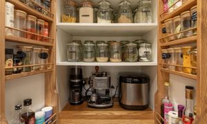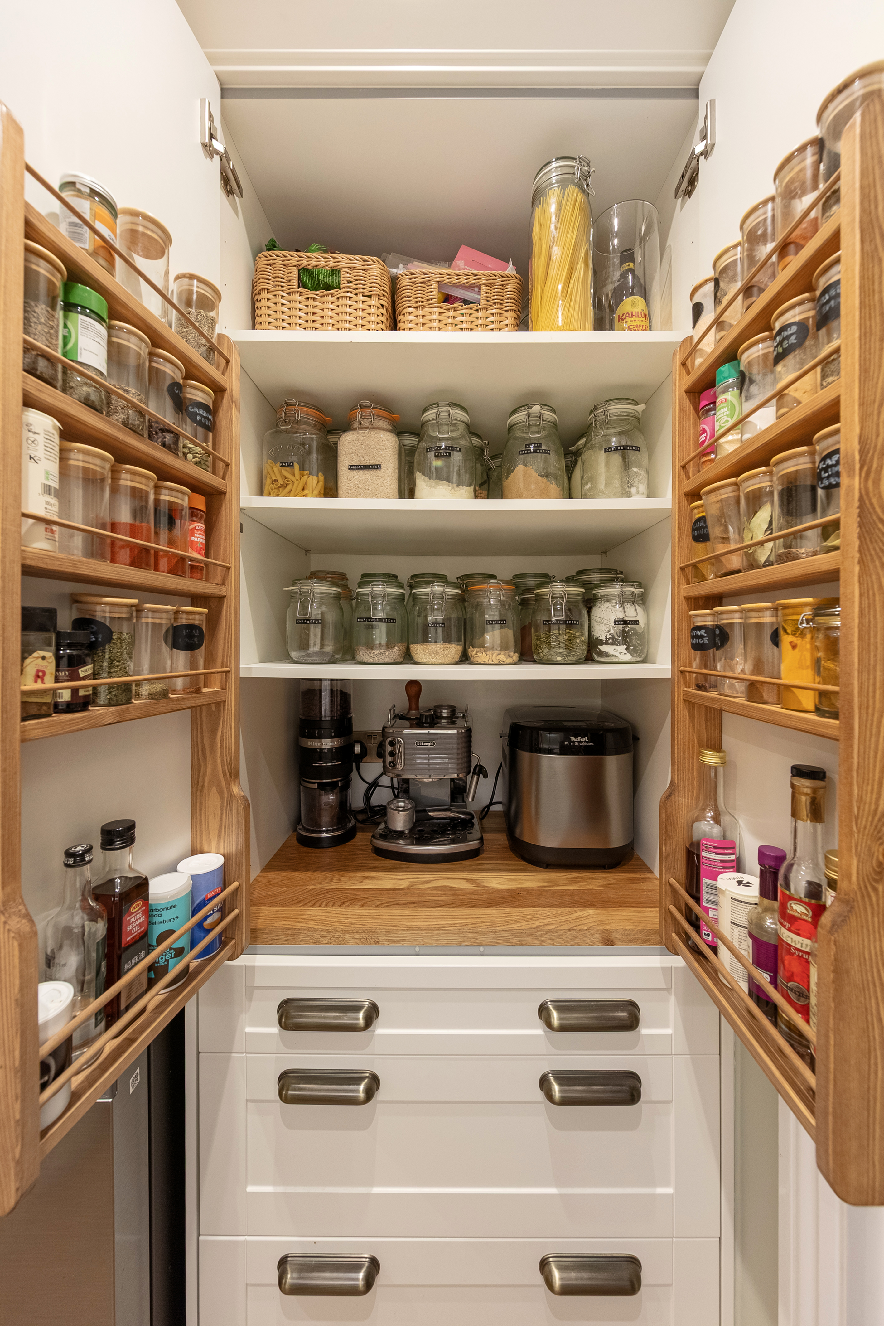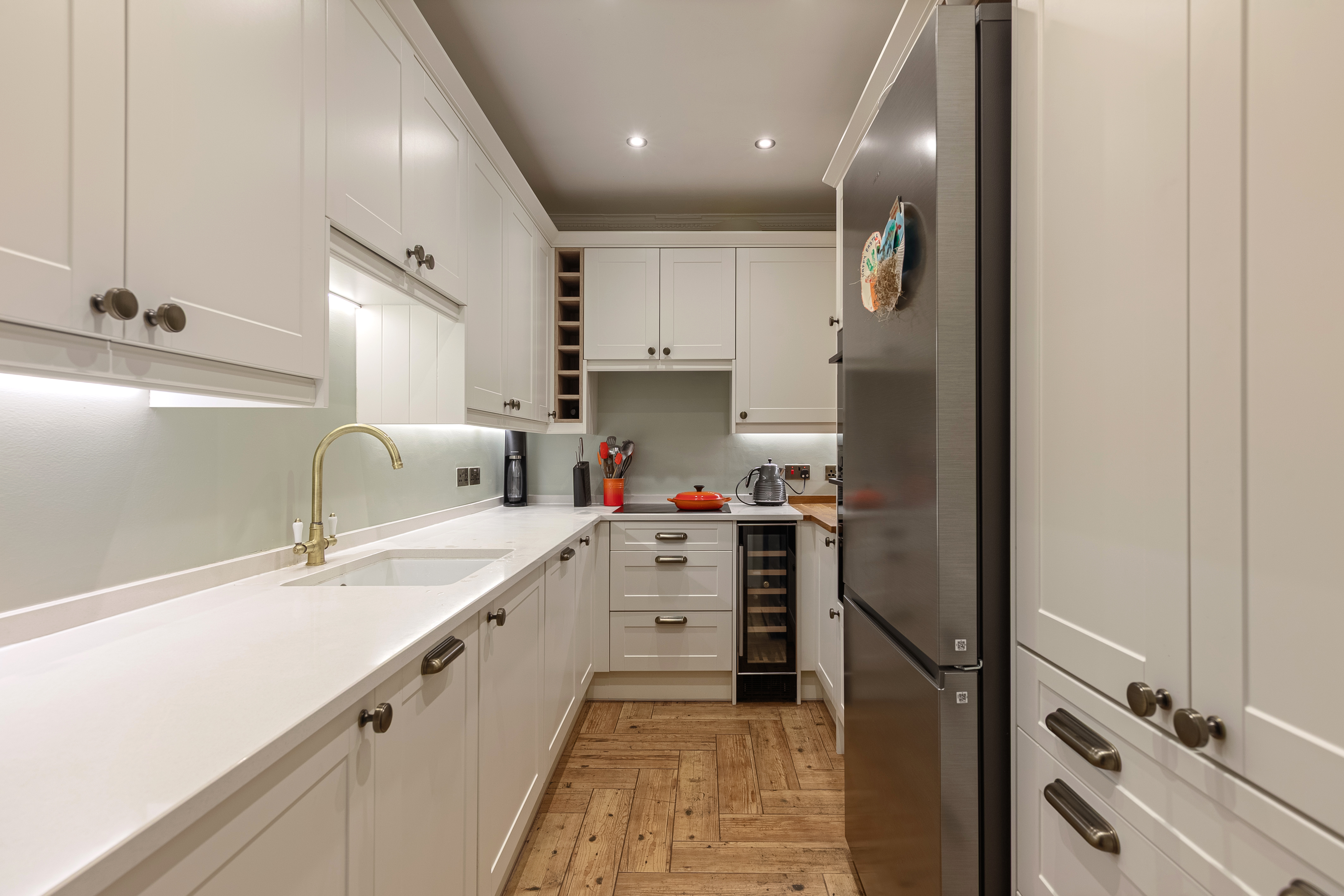 The kitchen was completely redone in December 2024, and it is seriously good. Custom carpentry throughout, a bespoke pantry cupboard that handles everything a well-stocked kitchen needs and then some, three Samsung smart ovens you can control from your phone — yes, really — a built-in microwave, a built-in air fryer, an integrated washing machine, tumble dryer, dishwasher, and a wine fridge. There's a dual tap over a Belfast ceramic undermount sink, quartz worktops, antique brass hardware on shaker-style units, and LED underlighting. The herringbone flooring continues underfoot. This is a kitchen that has been thought about properly, and the storage alone would make most houses feel underprepared.
